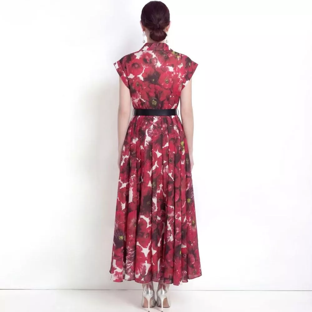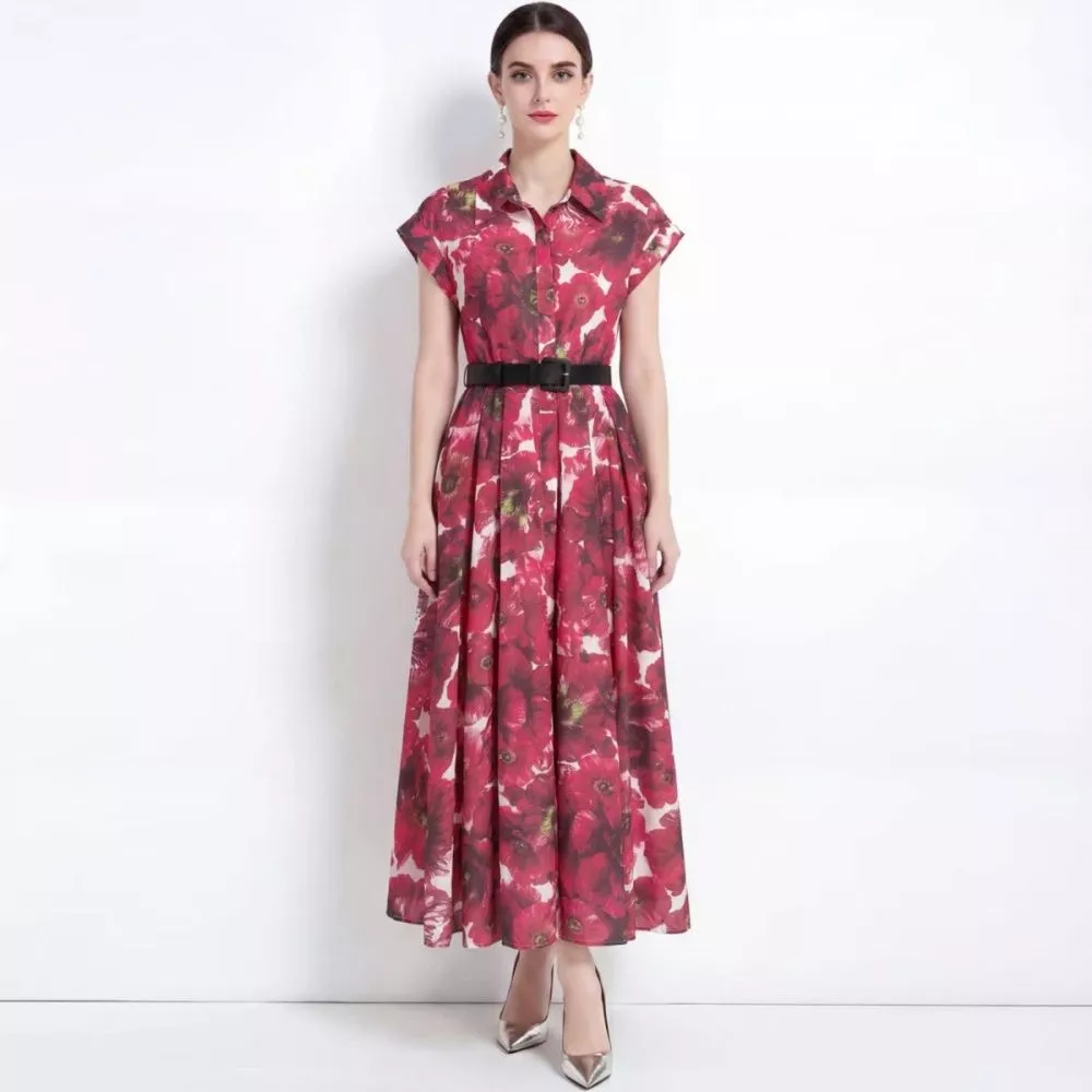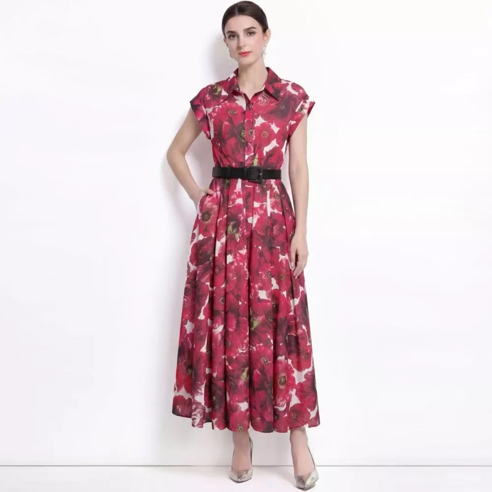 Vestito Lungo Donna Elegante Stile Camicia con Cintura Floreale Rosso CF70617