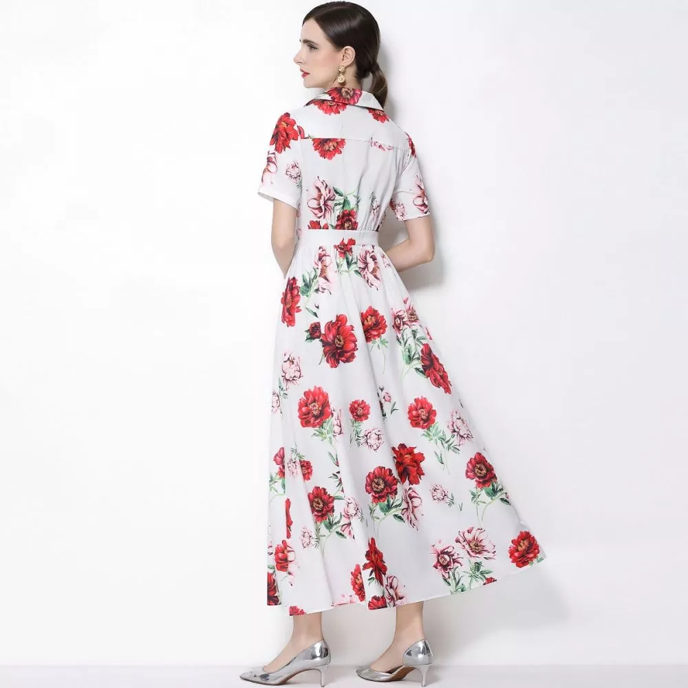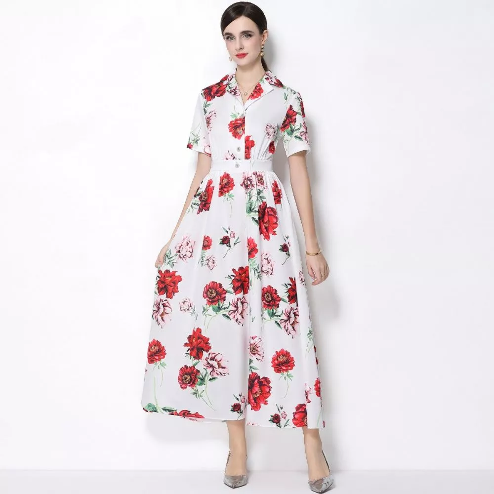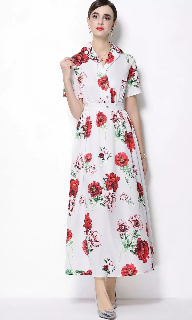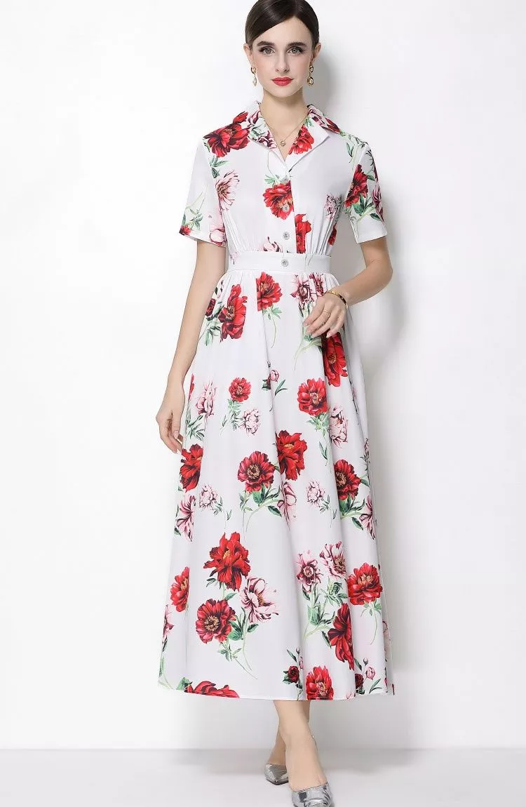 Vestito lungo da donna con stampa floreale dal gusto raffinato e femminile, pensato per valorizzare la silhouette grazie alla linea morbida e alla vita leggermente definita. Il colletto classico e la chiusura frontale donano ordine ed equilibrio al design, mentre le maniche corte rendono il modello ideale anche nelle stagioni più miti. La fantasia floreale su fondo chiaro illumina l'insieme e rende questo vestito perfetto per eventi, cerimonie e occasioni eleganti in cui è richiesto uno stile curato ma naturale.