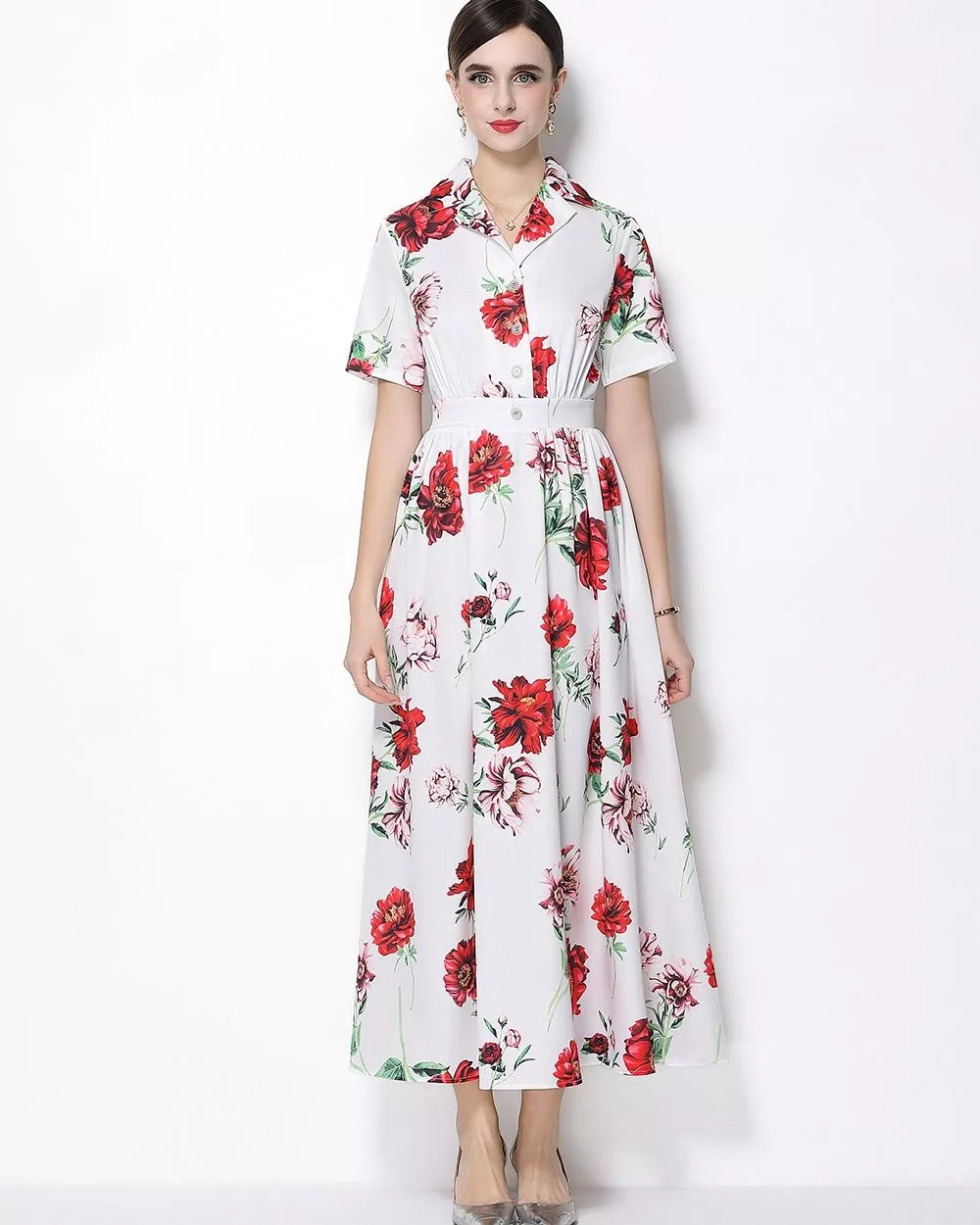 Vestito Lungo Donna Floreale Con Colletto E Maniche Corte Linea Elegante CF66024