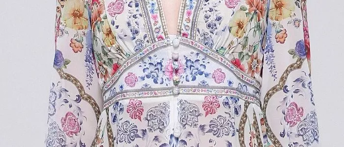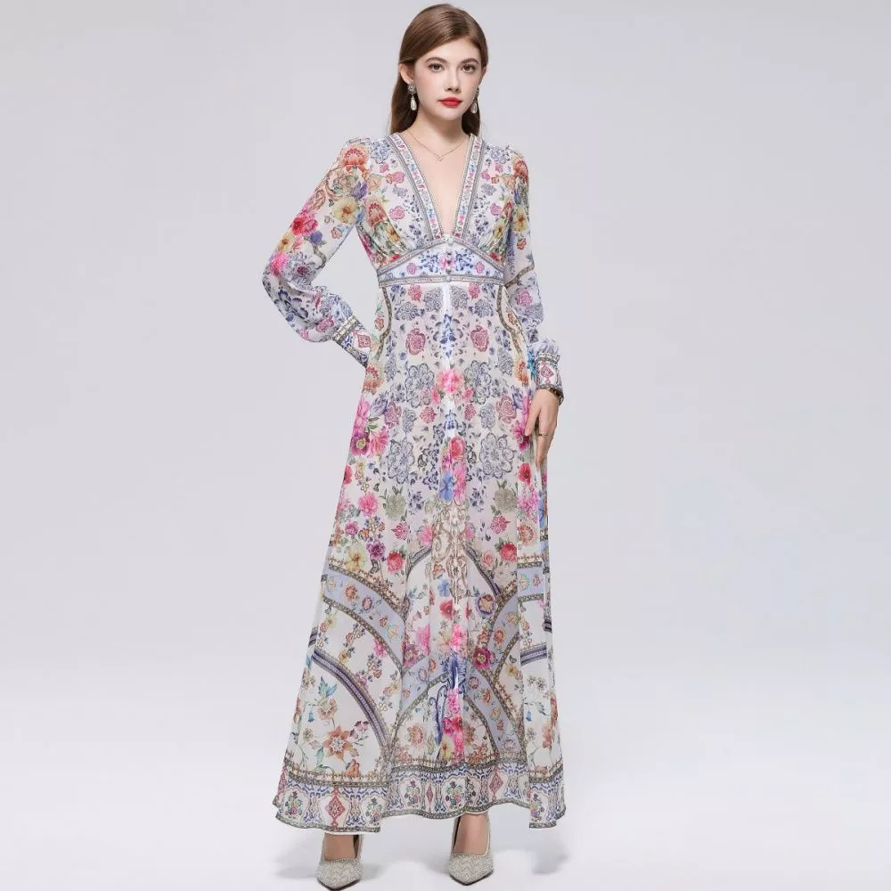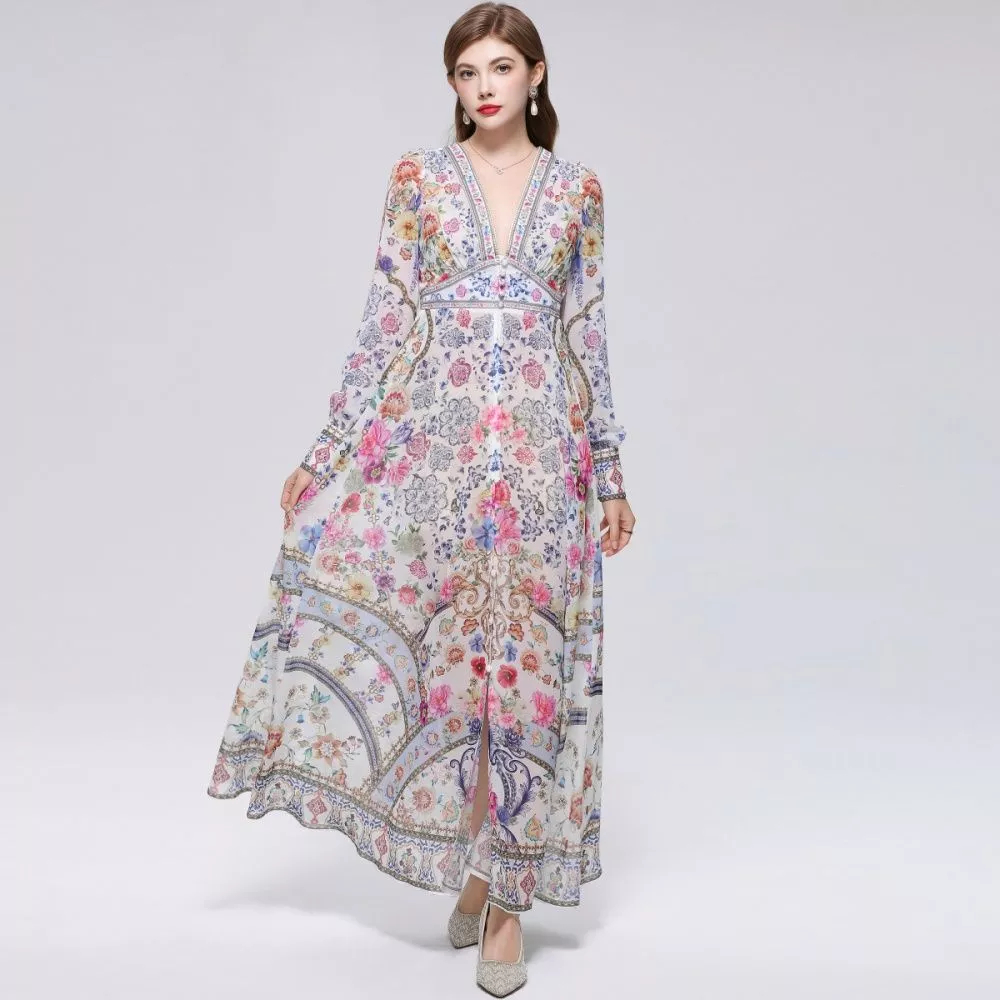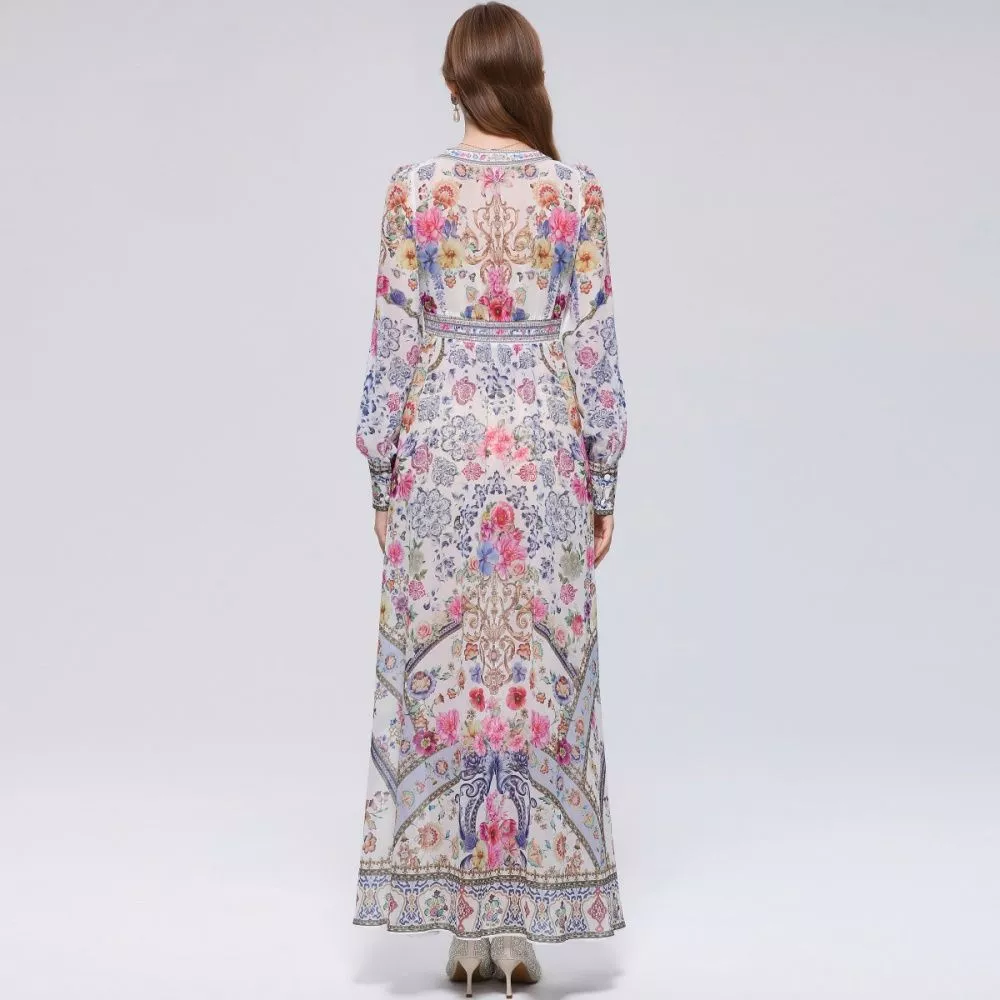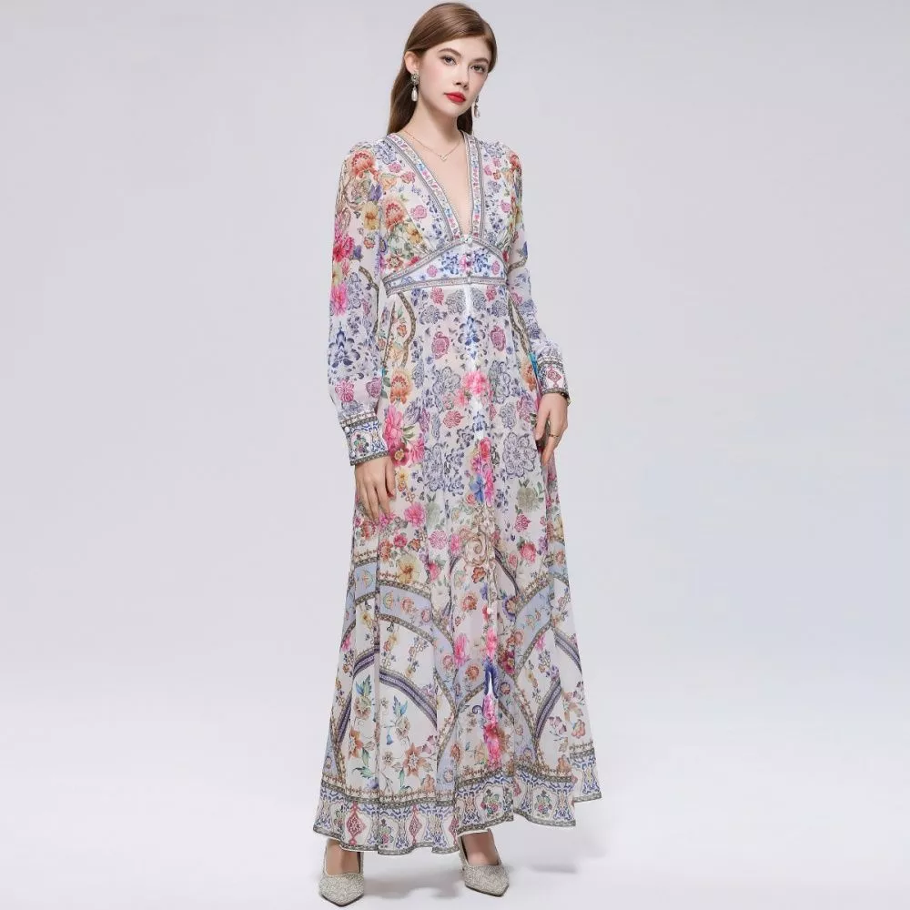 Vestito lungo elegante con stampa floreale ricca e dettagli decorativi, caratterizzato da uno stile boho raffinato che unisce eleganza e personalità. La linea fluida valorizza la figura mantenendo comfort e movimento, mentre i bottoni frontali e la cintura in vita definiscono la silhouette con equilibrio. Le maniche lunghe completano il design, rendendo il capo ideale per chi cerca un look distintivo e curato nei dettagli.