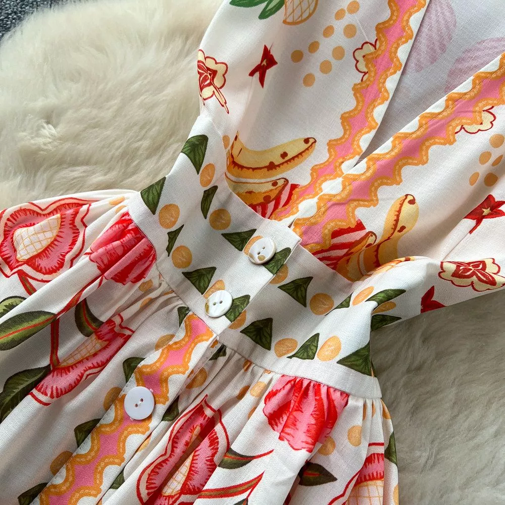 Vestito lungo donna dal design vivace e raffinato, caratterizzato da una fantasia colorata su base chiara che richiama atmosfere estive e vacanziere. Il modello valorizza la figura grazie alla vita definita e alla linea fluida che accompagna il movimento.