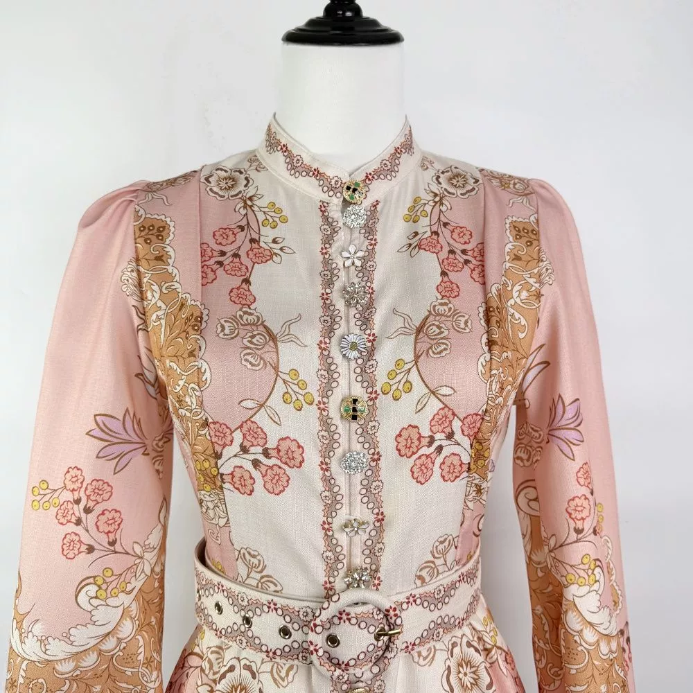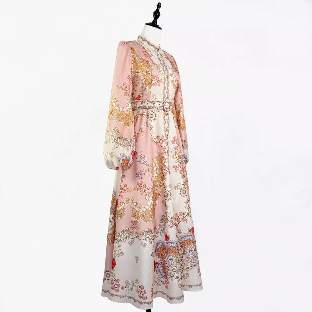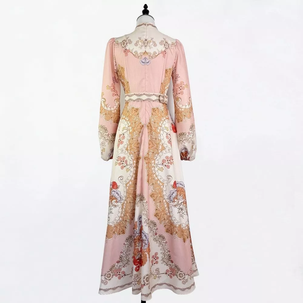 Vestito lungo da donna dal gusto raffinato e femminile, caratterizzato da una fantasia floreale ornamentale distribuita su tutta la superficie. Il modello presenta collo alto con profilo decorato, maniche lunghe leggermente arricciate e vita definita da cintura coordinata, che valorizza la silhouette mantenendo una linea elegante ed equilibrata.