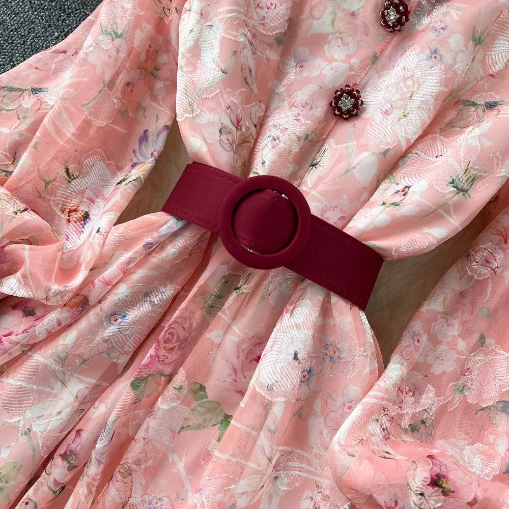Vestito Lungo Donna Rosa Floreale Vita Alta Cerimonia Romantico CF67933