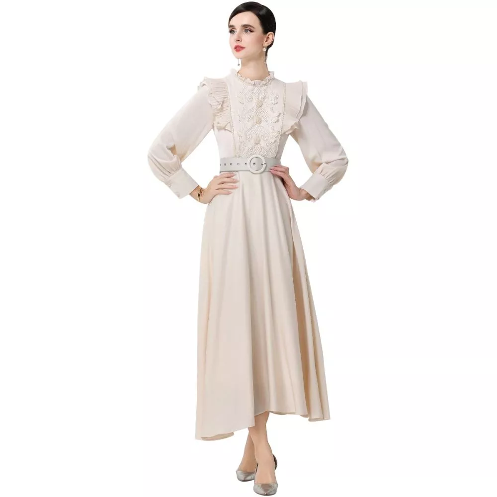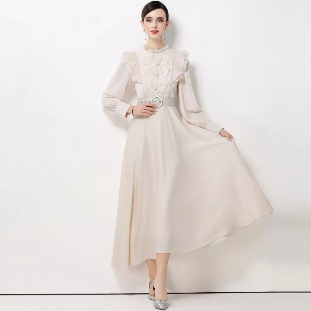 Vestito lungo elegante dal gusto romantico, caratterizzato da un raffinato ricamo floreale sul busto e da una linea fluida che accompagna il movimento. Le maniche lunghe con leggere finiture decorative donano equilibrio al design, rendendo il modello ideale per cerimonie, eventi formali e occasioni speciali in cui è richiesto un look femminile e curato.