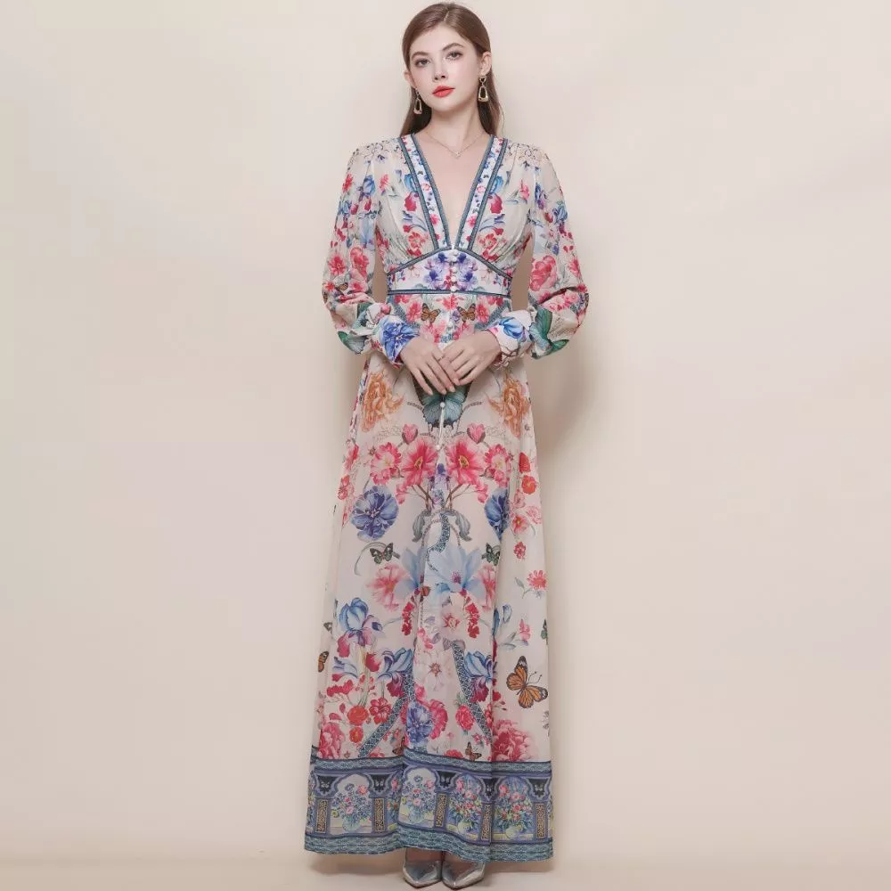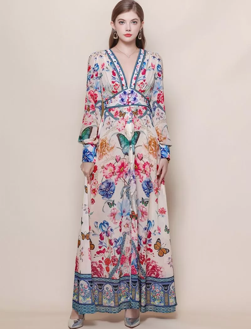 Vestito lungo elegante dal forte impatto visivo, caratterizzato da una base avorio luminosa arricchita da una stampa floreale multicolor con dettagli artistici e decorativi. La linea fluida accompagna la silhouette con armonia mentre la cintura in vita definisce le forme valorizzando la figura. Il design ricercato e i contrasti cromatici rendono questo capo distintivo e scenografico, perfetto per chi desidera un look elegante e originale.