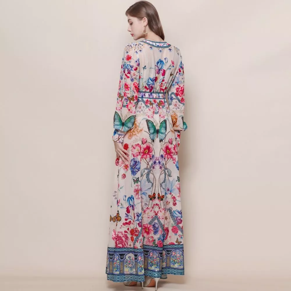 Vestito Lungo Elegante Avorio Floreale Multicolor Con Cintura Chic CF69378