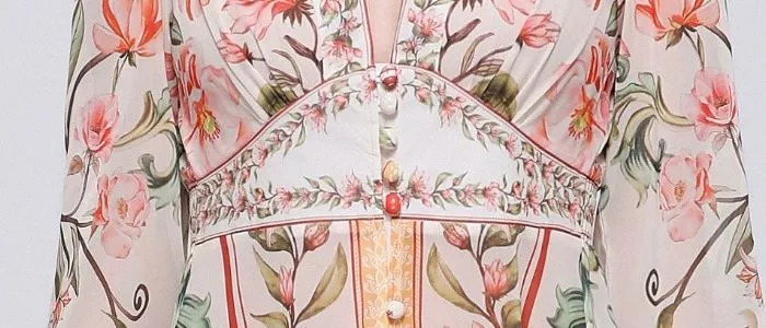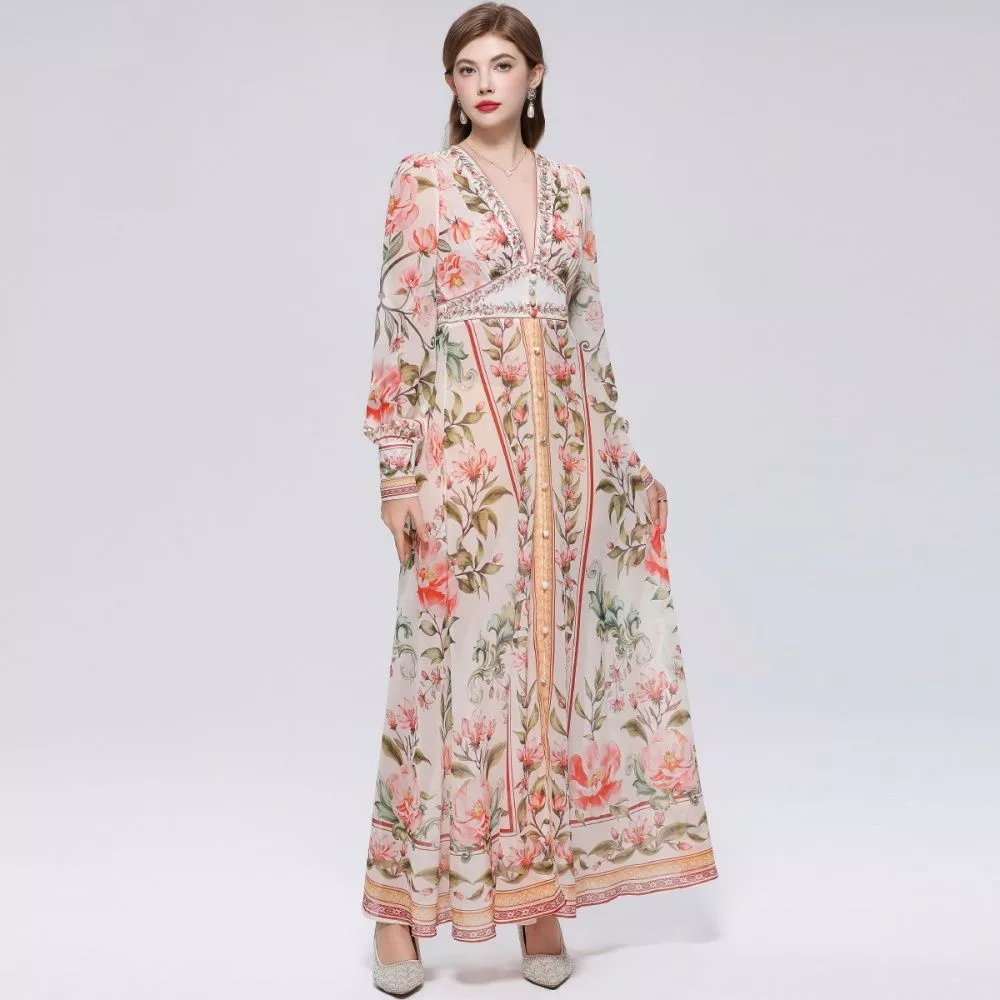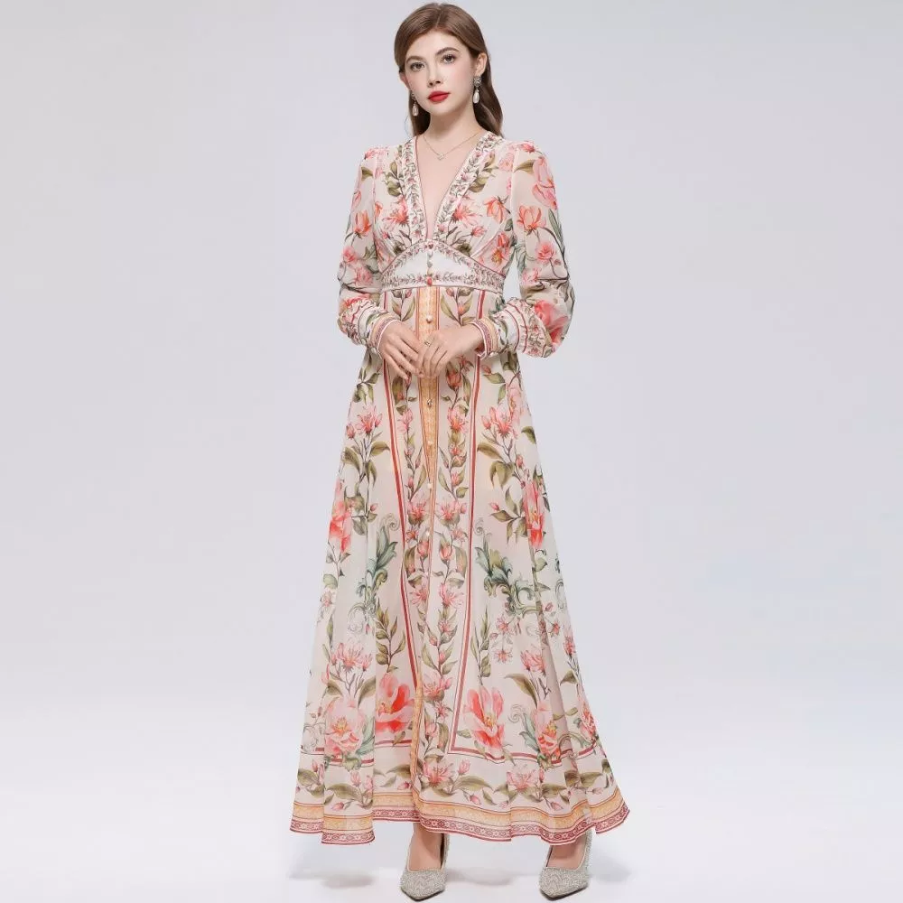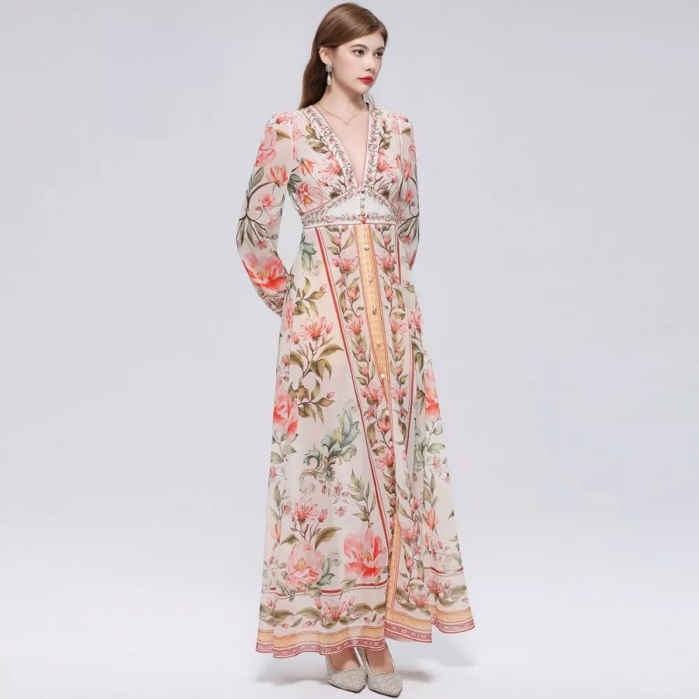 Vestito lungo elegante da donna in tonalità beige con stampa floreale nei toni del rosa e del verde, caratterizzato da un design leggero e armonioso. La linea fluida valorizza la figura con naturalezza, mentre lo scollo a V slancia la silhouette creando un effetto equilibrato. Le maniche lunghe leggere completano il capo, rendendolo ideale per un look elegante e delicato.