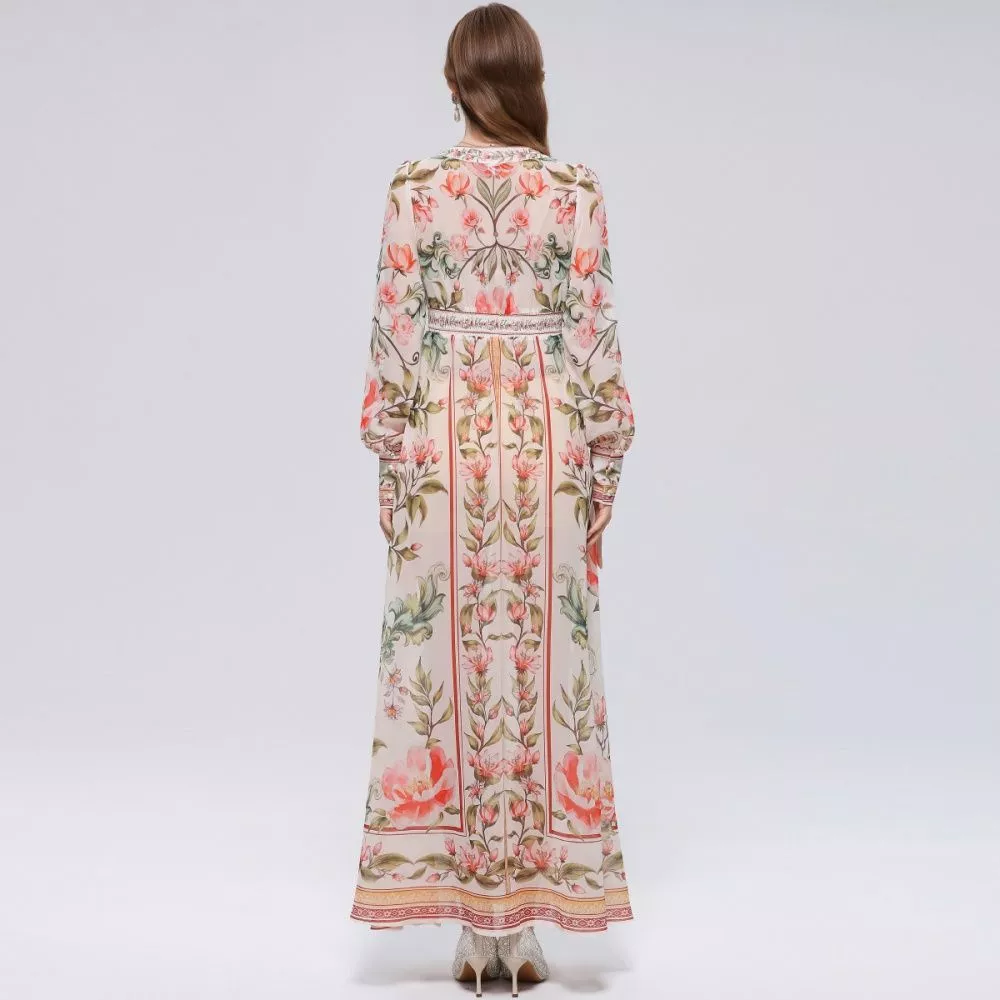 Vestito Lungo Elegante Beige Floreale Rosa e Verde con Maniche Lunghe CF71017