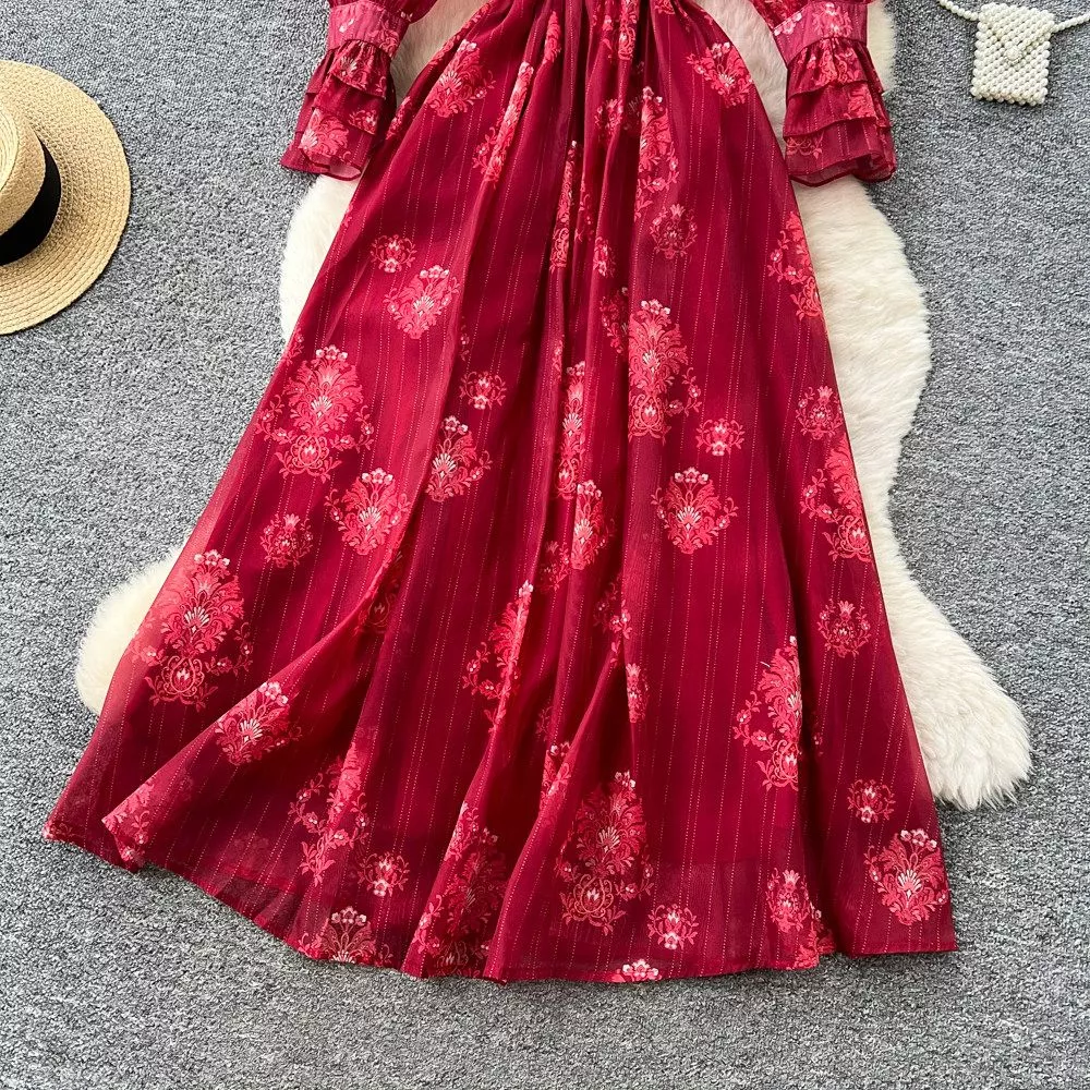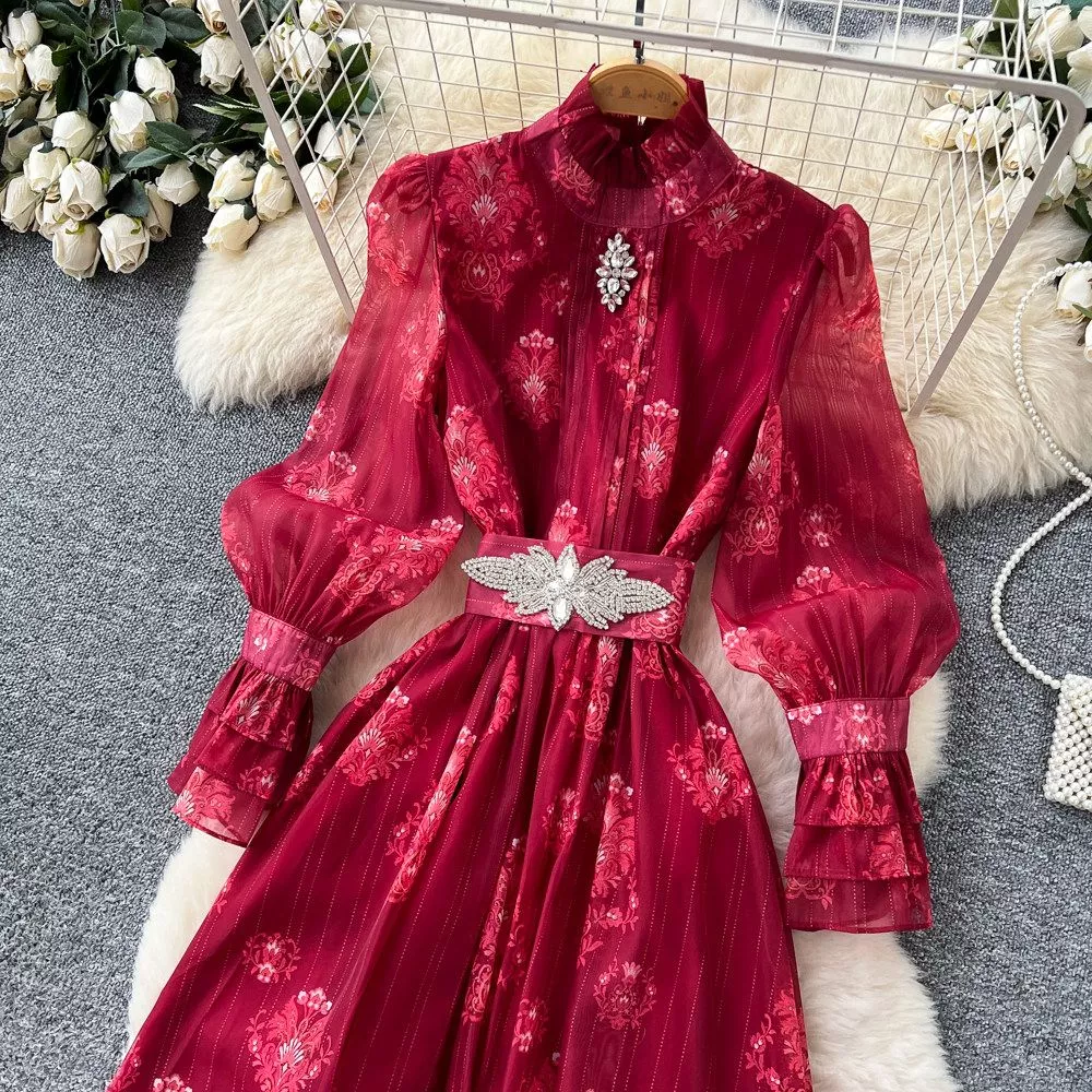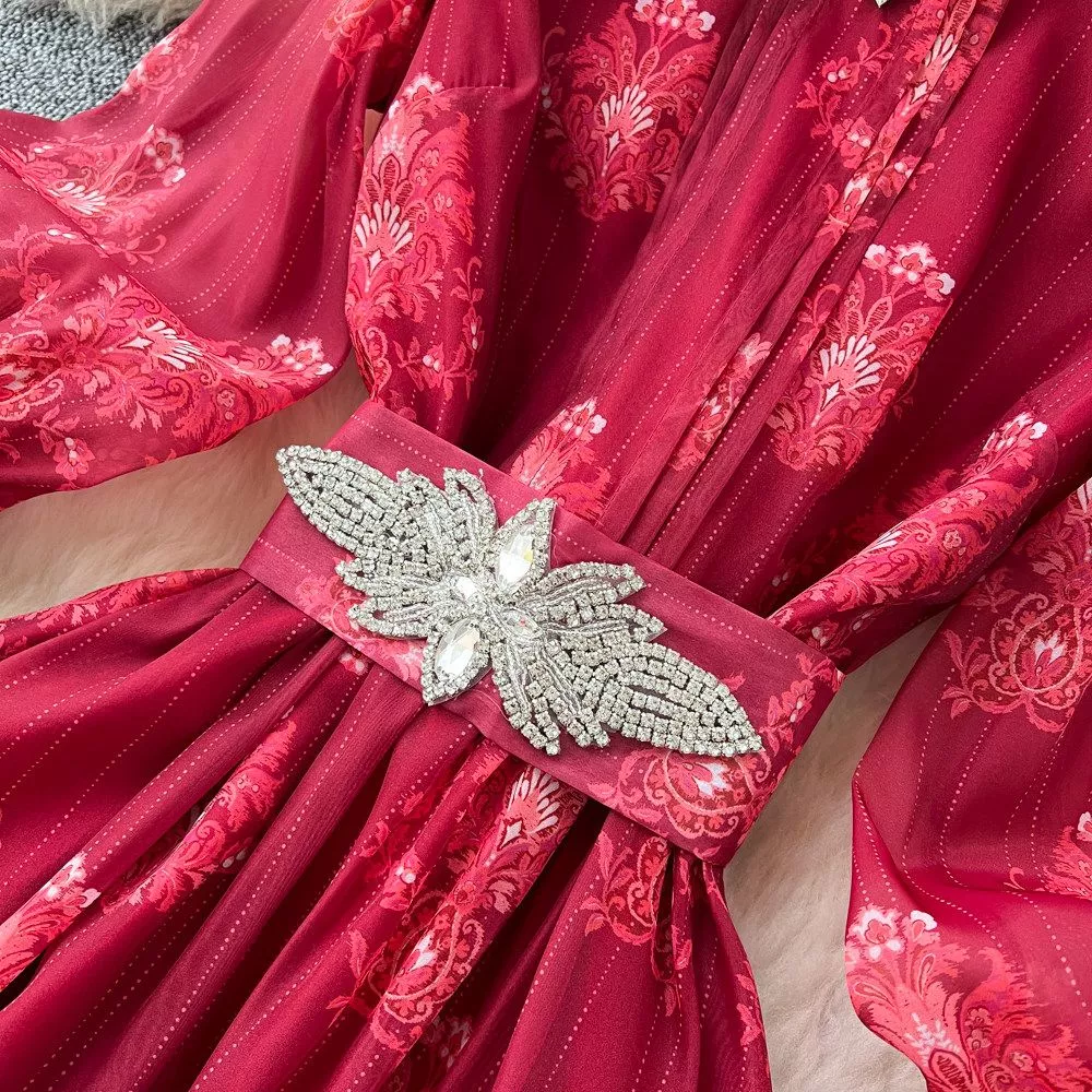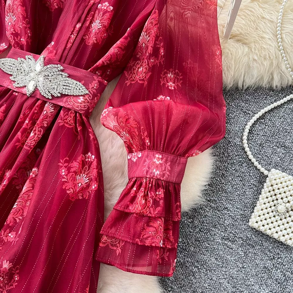 Vestito Lungo Elegante Borgogna Ricamato Con Cintura Gioiello CF67936