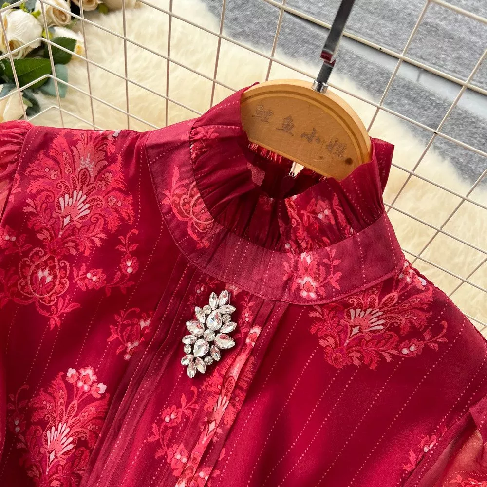 Il tessuto leggero e strutturato dona movimento alla gonna ampia, creando un effetto scenografico ideale per cerimonie, eventi e occasioni formali. Le maniche lunghe con balza aggiungono un tocco romantico, mentre il taglio fluido assicura comfort e vestibilità elegante.