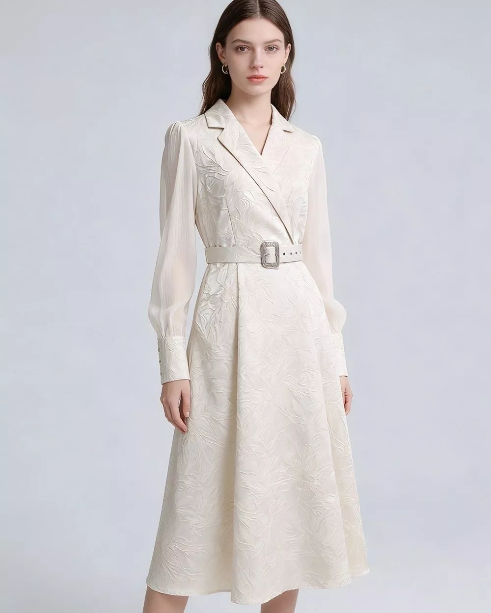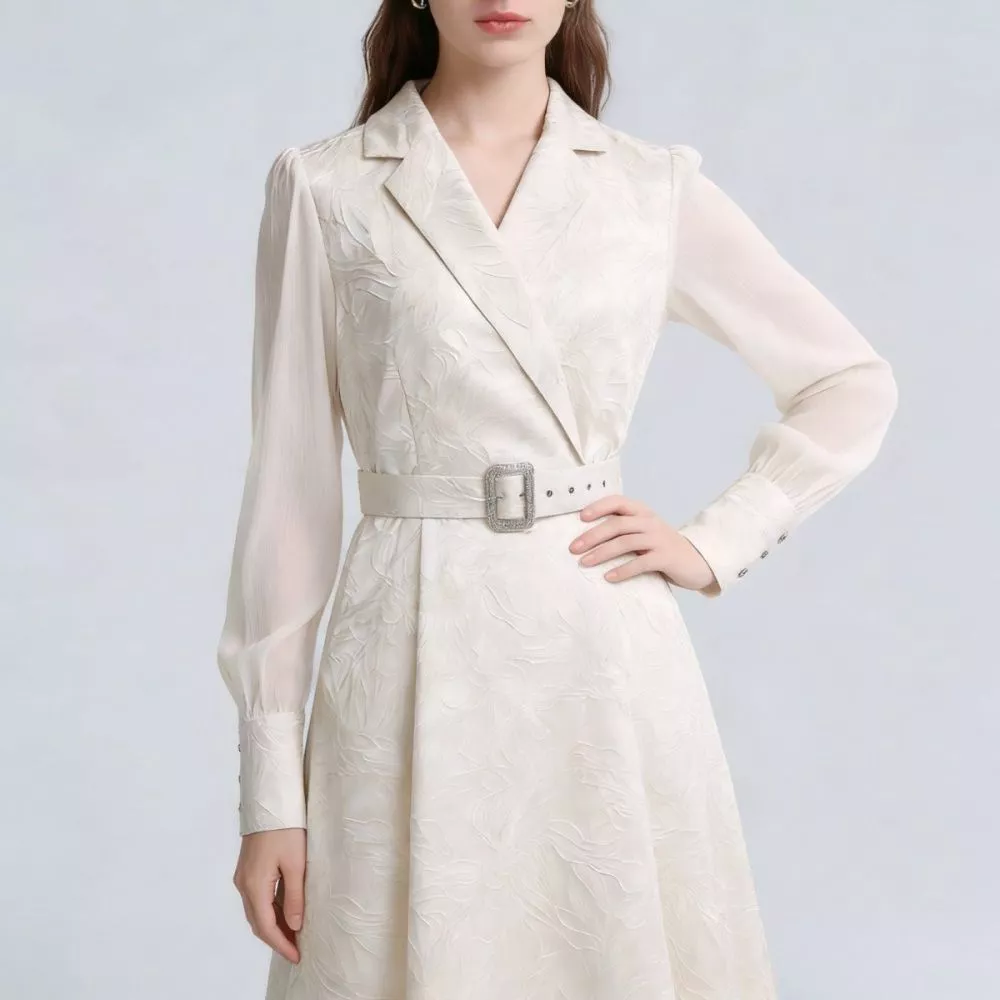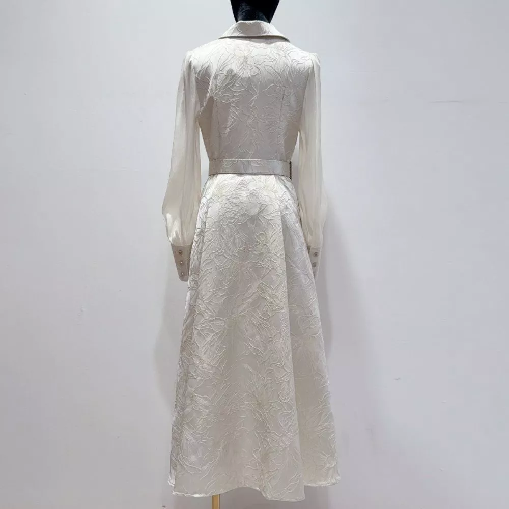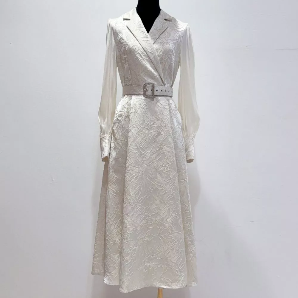 Vestito Lungo Elegante Con Cintura Jacquard Albicocca Maniche Lunghe CF66020