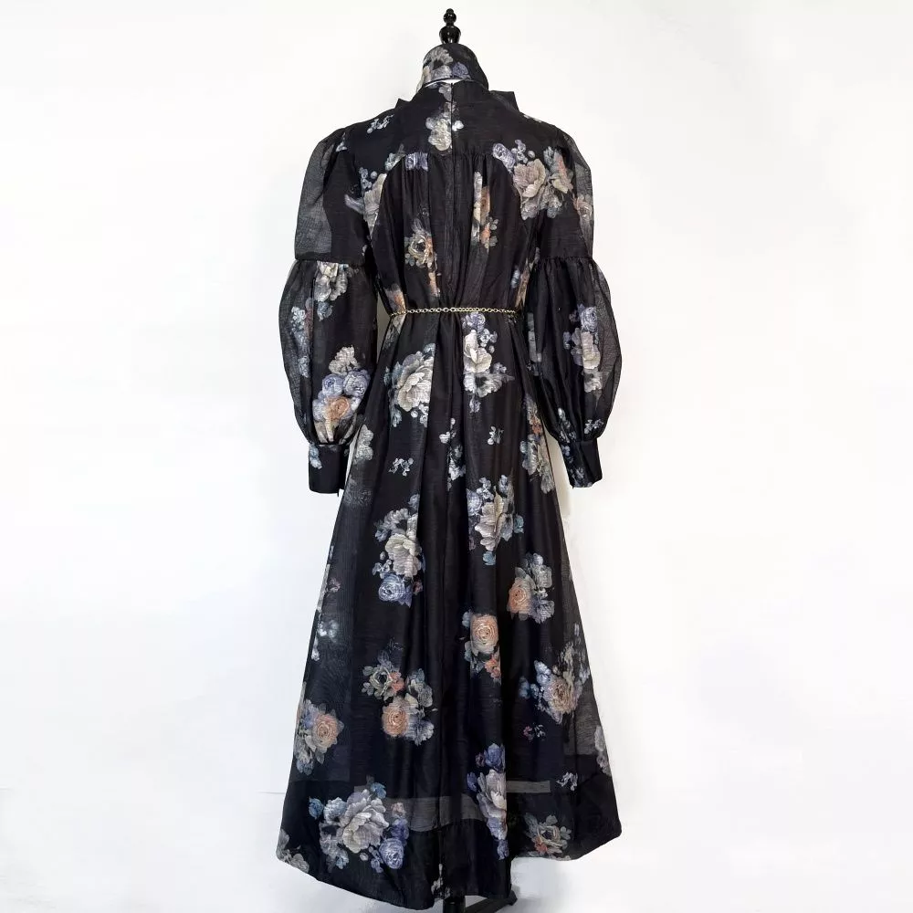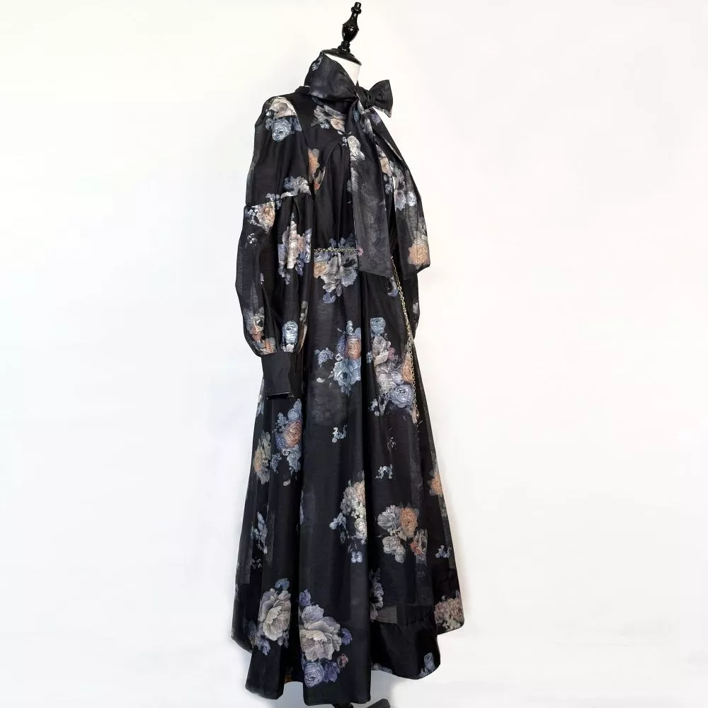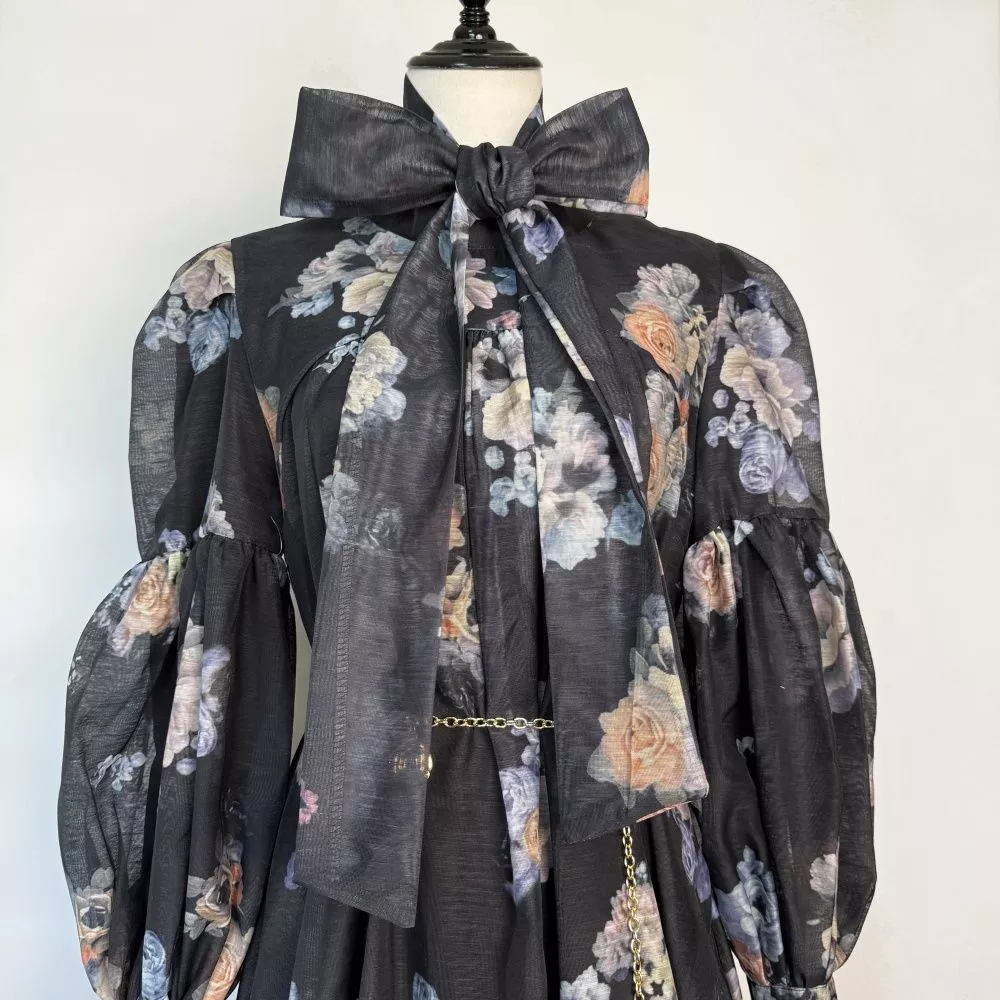 Vestito Lungo Elegante Con Fiocco E Maniche Ampie Fantasia Floreale Nero CF61114