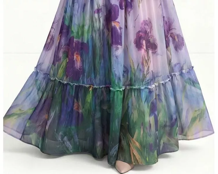 Vestito Lungo Elegante Fantasia Floreale Viola Verde Cerimonia CF66688