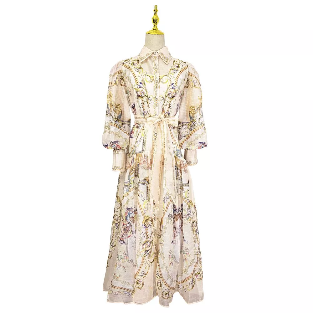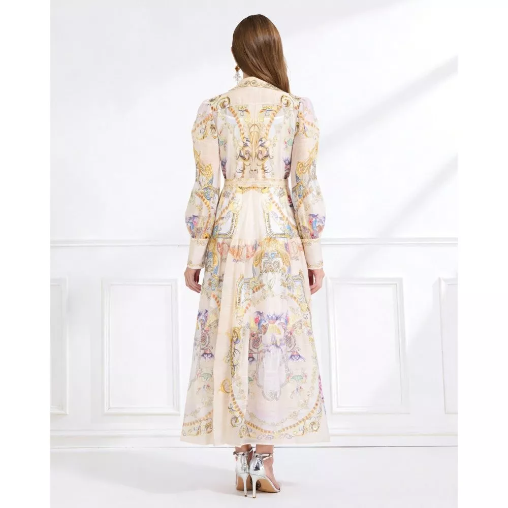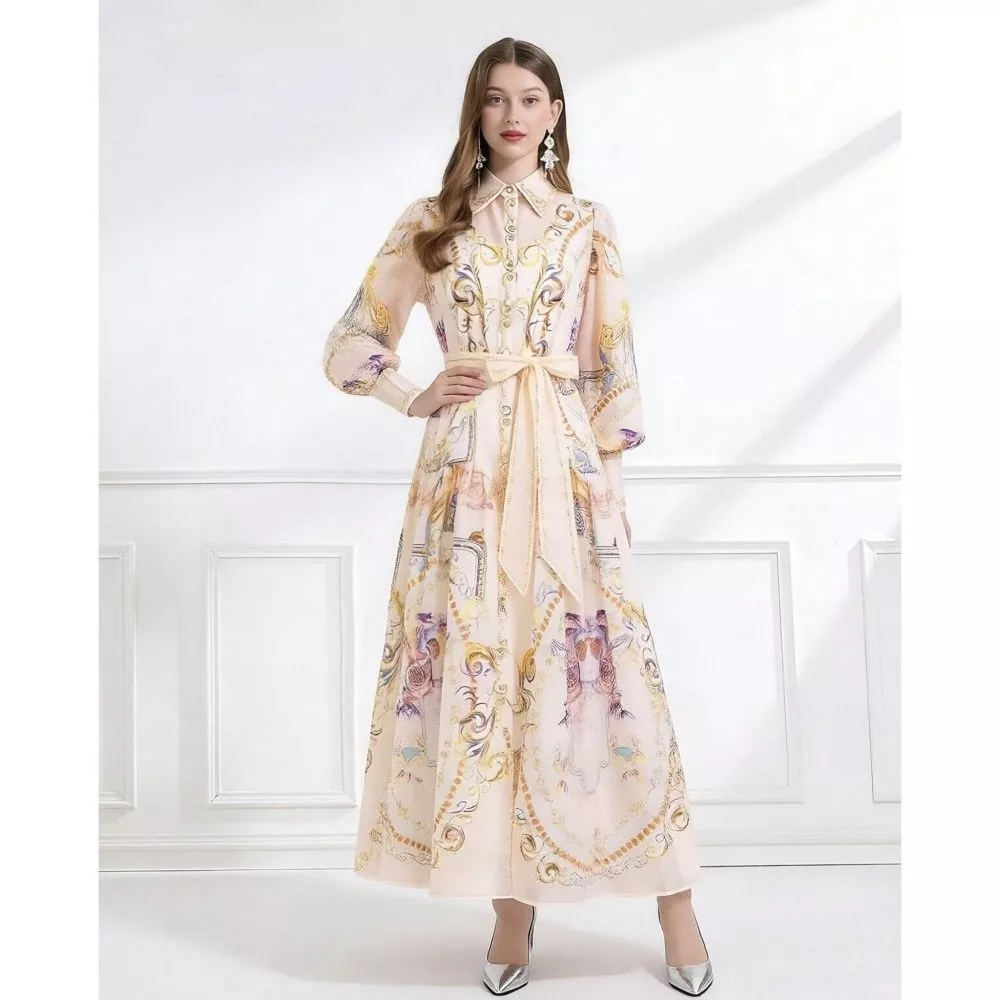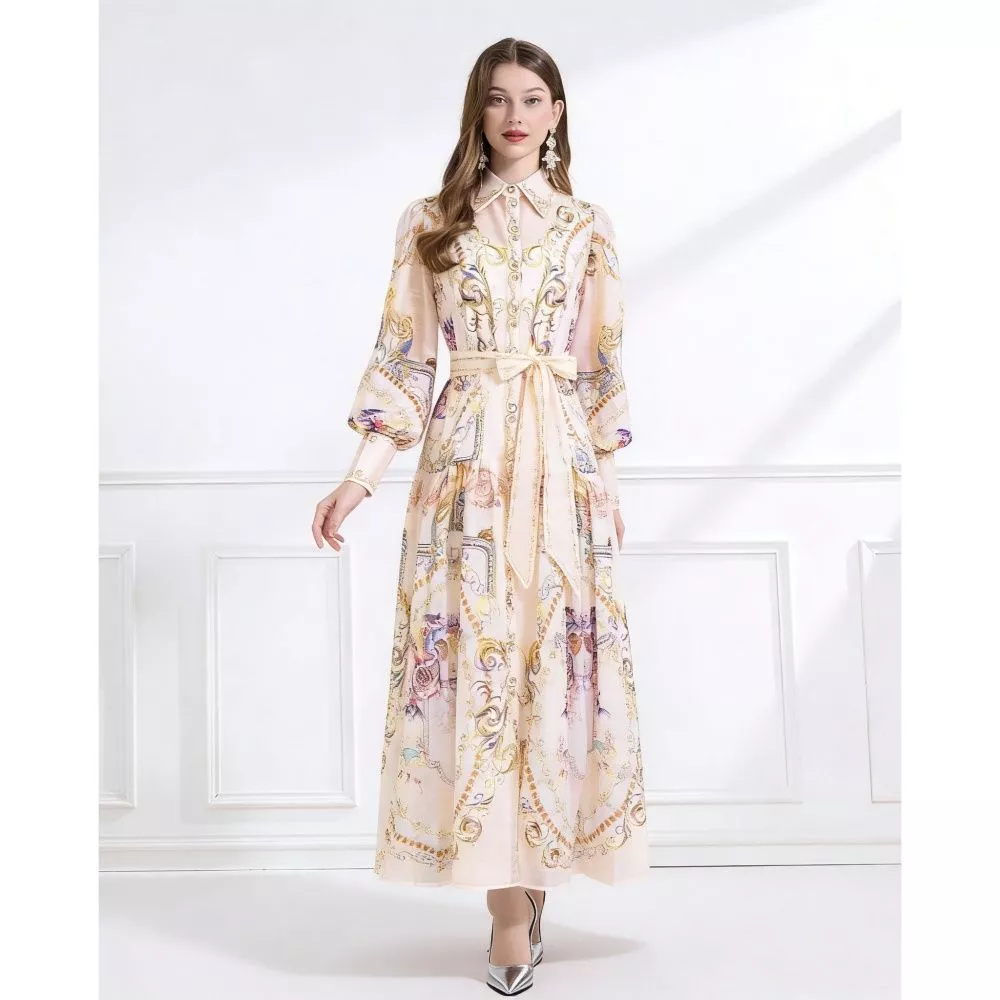Vestito lungo elegante caratterizzato da una base beige champagne luminosa, arricchita da una raffinata stampa ornamentale tono su tono. Il design delicato e armonioso crea un effetto sofisticato, perfetto per un’eleganza discreta ma ricercata.