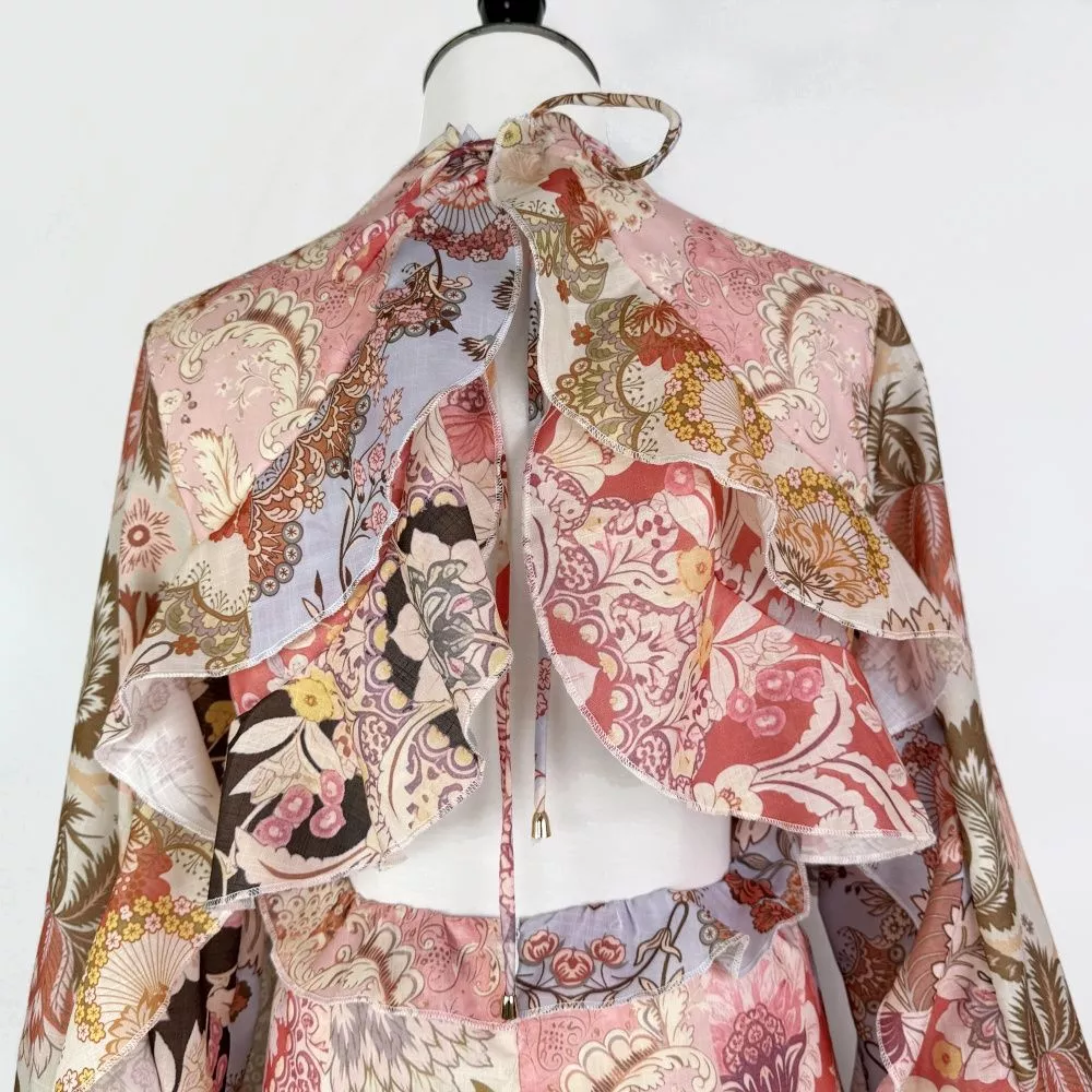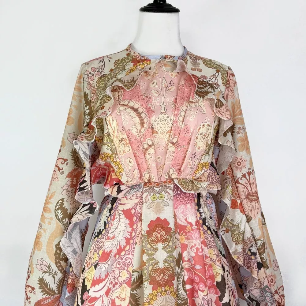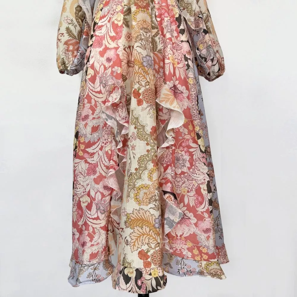 Vestito lungo elegante con stampa floreale romantica e silhouette fluida dal forte impatto scenico. Il corpetto valorizza il punto vita mentre i volant frontali creano movimento e femminilità. Il design raffinato rende questo abito ideale per cerimonie, eventi e occasioni speciali dove è richiesto uno stile sofisticato e ricercato.
