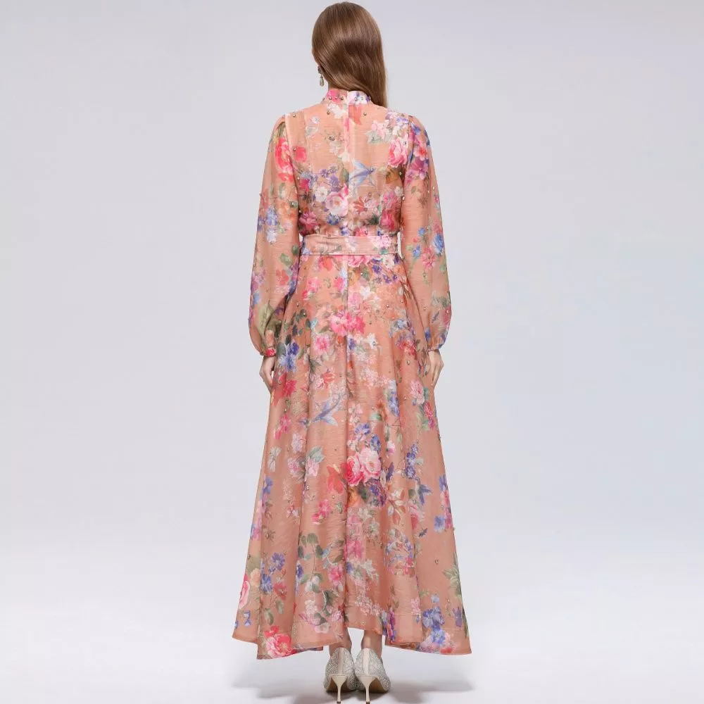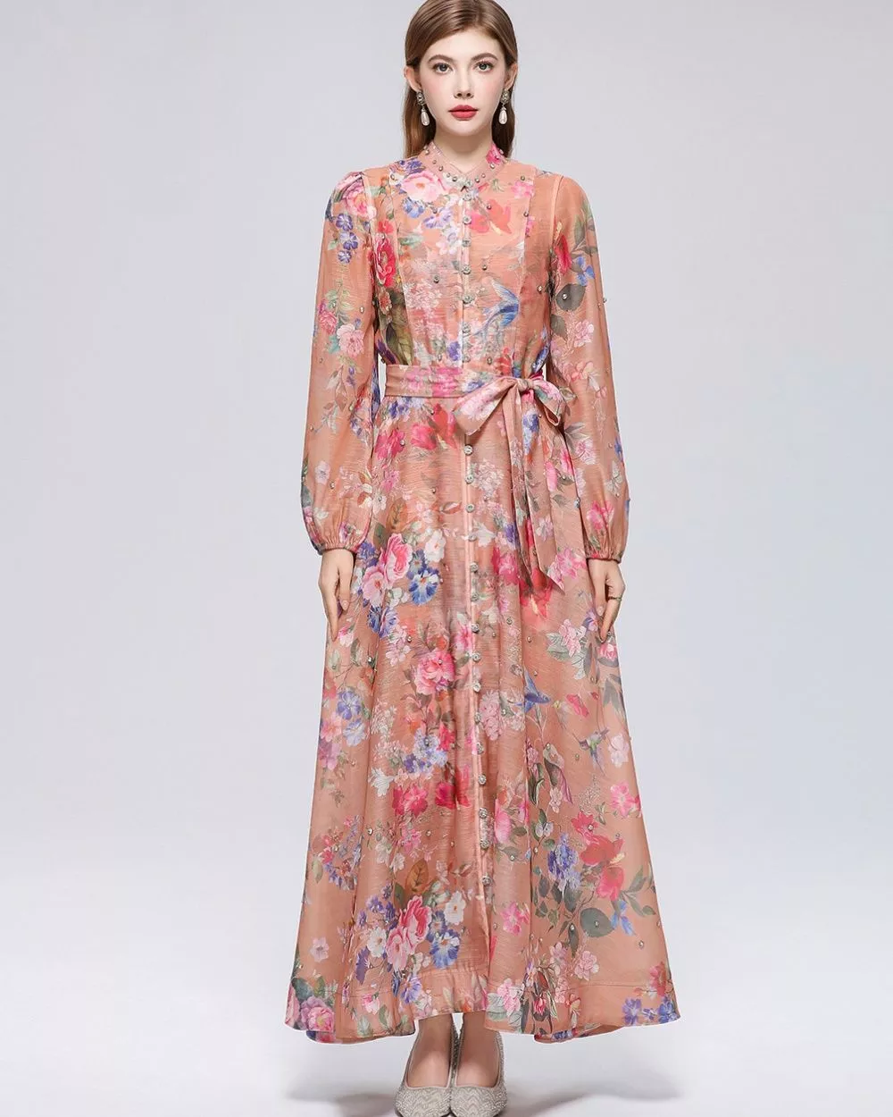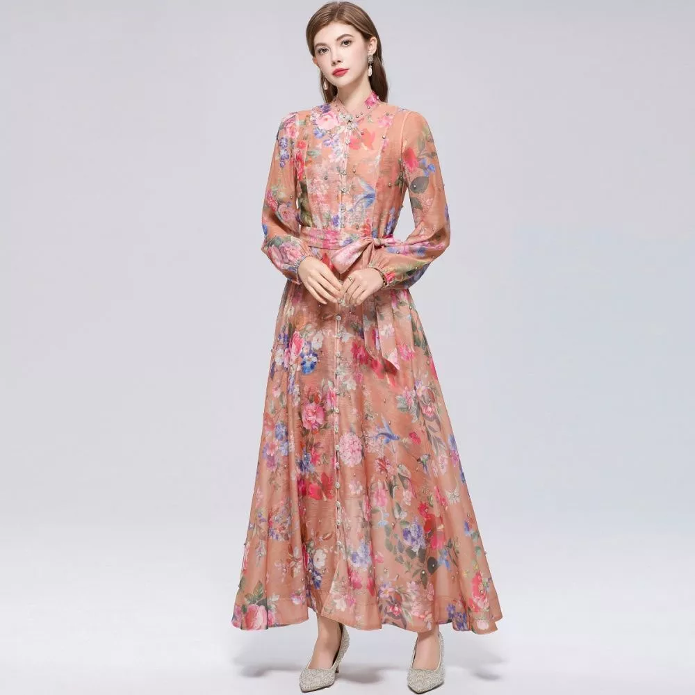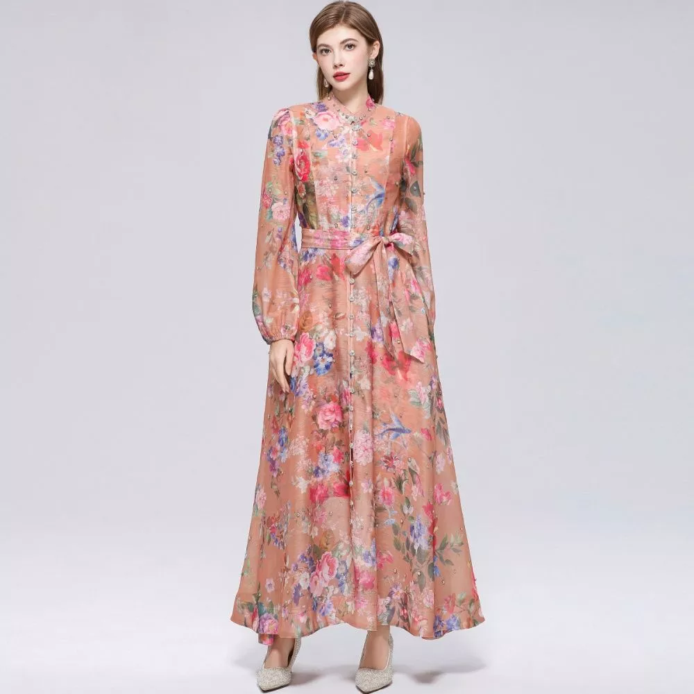 Vestito Lungo Elegante Floreale Ruggine Multicolor Vita Cintura Morbido CF69996