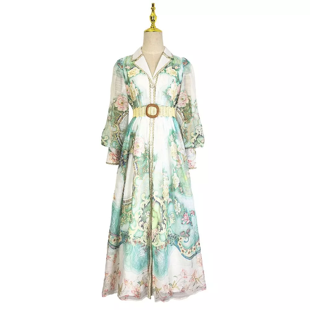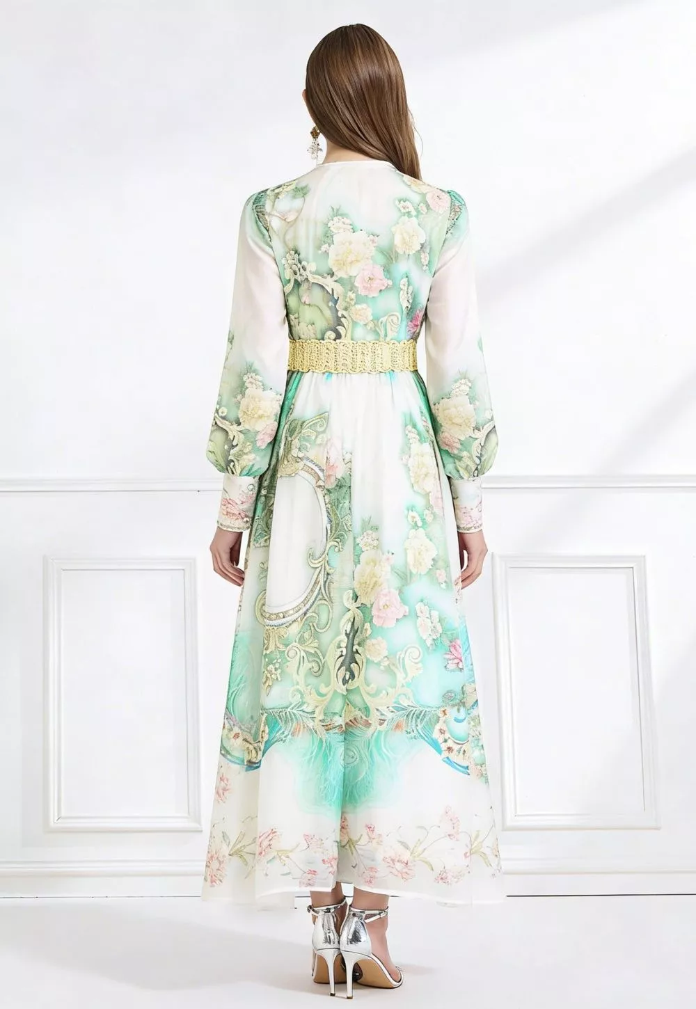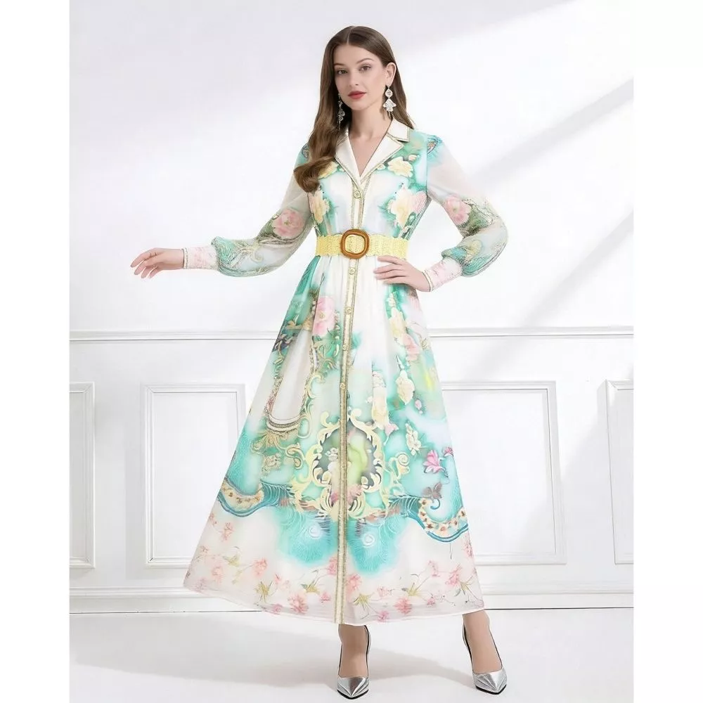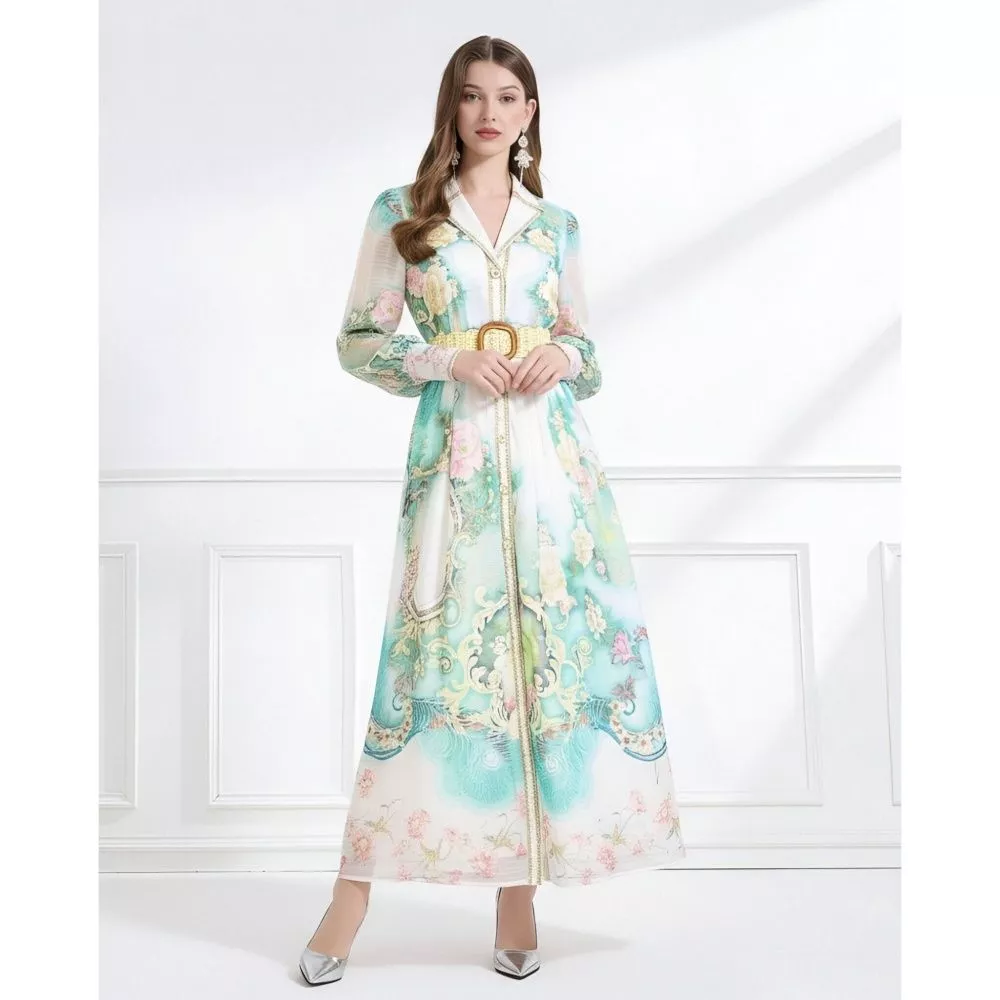Vestito lungo elegante con stampa floreale nei toni del verde acqua, caratterizzato da un design raffinato che valorizza la silhouette grazie alla cintura in vita. Il taglio fluido e la linea armoniosa donano movimento e leggerezza, rendendolo perfetto per occasioni eleganti, cerimonie e look curati con un tocco sofisticato e distintivo.