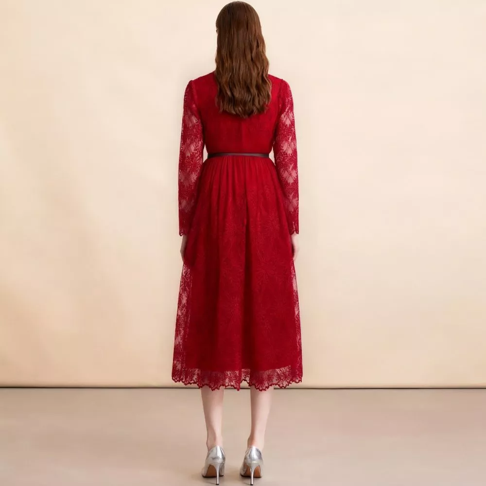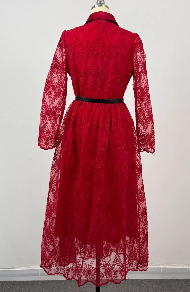 Vestito Lungo Elegante In Pizzo Rosso Con Bottoni Oro E Colletto Camicia CF60528