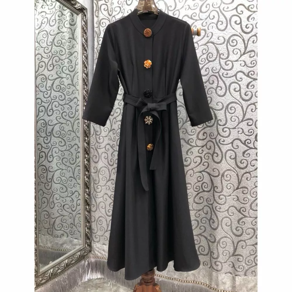 Vestito Lungo Elegante Nero Con Collo Alla Coreana E Cintura In Vita CF66017