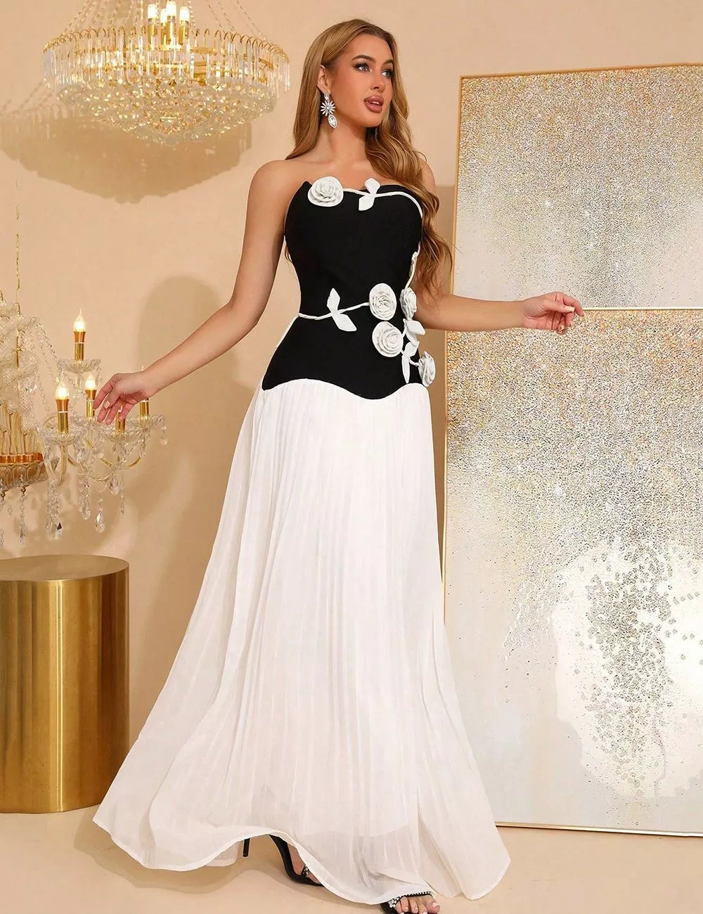 Vestito lungo elegante bicolore con corpetto nero aderente e raffinata gonna bianca plissettata dal movimento leggero e femminile. Le applicazioni floreali tridimensionali a contrasto valorizzano il punto vita creando un effetto scenografico sofisticato.