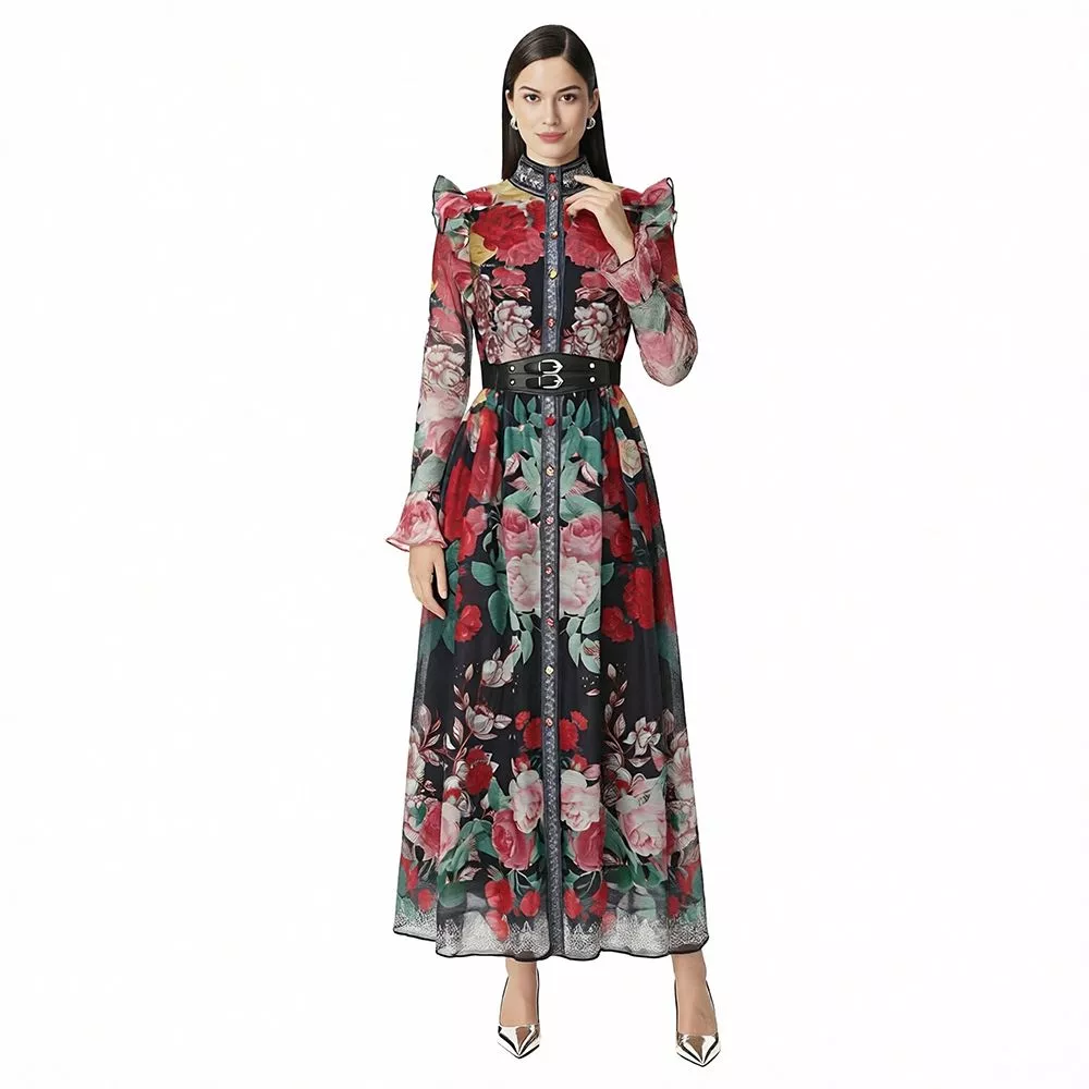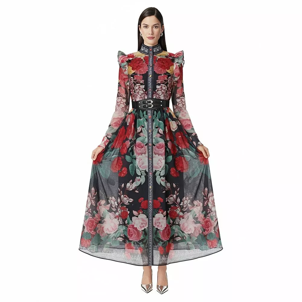 Vestito lungo elegante dal carattere deciso e sofisticato, caratterizzato da una base nera intensa arricchita da una stampa floreale ricca e contrastata. La struttura del design valorizza la figura grazie alla cintura in vita che definisce la silhouette con precisione, mentre le linee fluide donano movimento e armonia. Un capo raffinato e d’impatto, ideale per chi desidera un look elegante con personalità e presenza scenica.