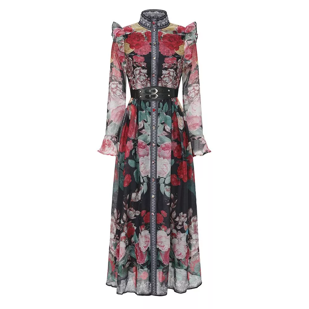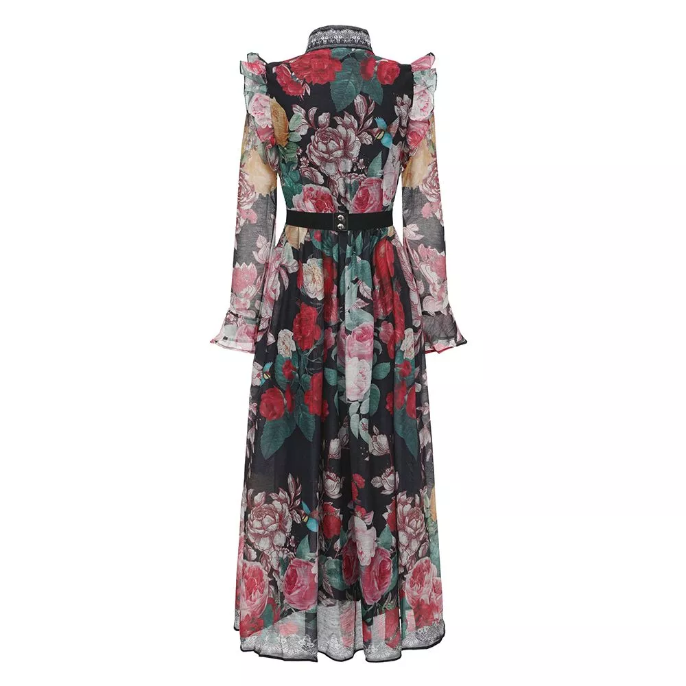 Vestito Lungo Elegante Nero Floreale Vita Stretta Con Cintura Chic CF69392