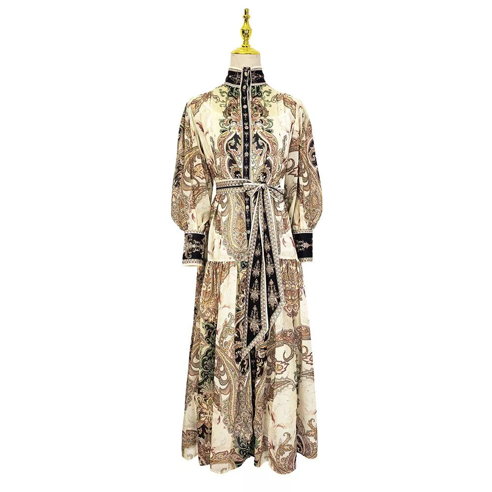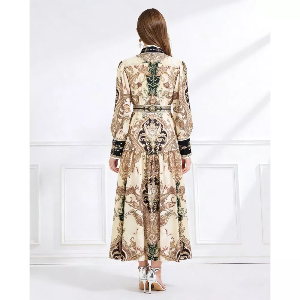 Vestito lungo elegante nero con stampa barocca ricca e dettagli ornamentali che creano un impatto visivo deciso e sofisticato. Il design con cintura in vita valorizza la figura, mentre il taglio fluido e la struttura del colletto donano carattere e presenza. Un capo distintivo pensato per chi cerca uno stile elegante ma originale, con forte personalità.
