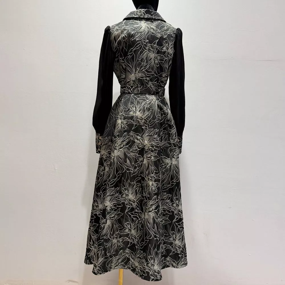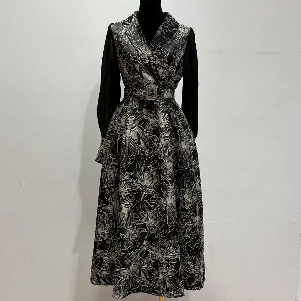 La cintura coordinata con fibbia decorativa definisce il punto vita, creando una silhouette slanciata ed equilibrata. Le maniche lunghe in tessuto leggermente velato aggiungono un tocco sofisticato e rendono il vestito ideale anche per stagioni intermedie.