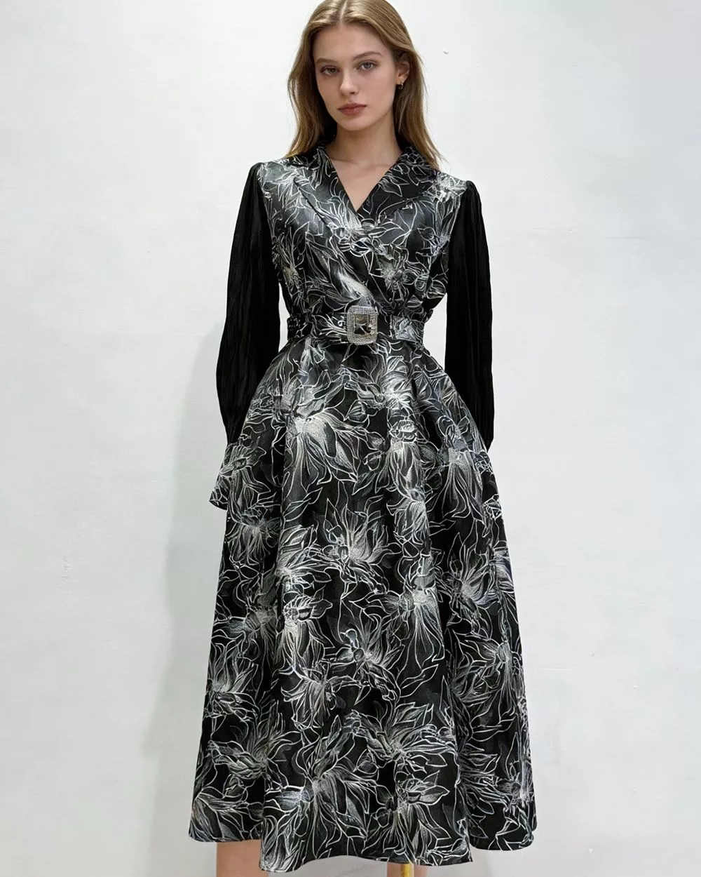 Vestito Lungo Elegante Nero Stampa Floreale Collo A V E Cintura In Vita CF66018