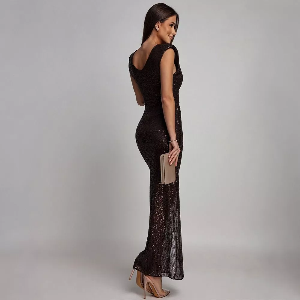Vestito lungo elegante con paillettes perfetto per serate, feste ed eventi speciali. La silhouette aderente valorizza la figura mentre lo scollo a V profondo dona femminilità e slancia la linea.