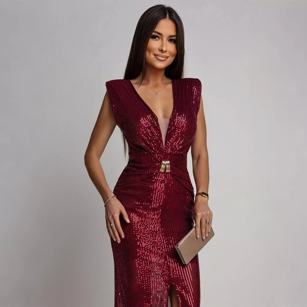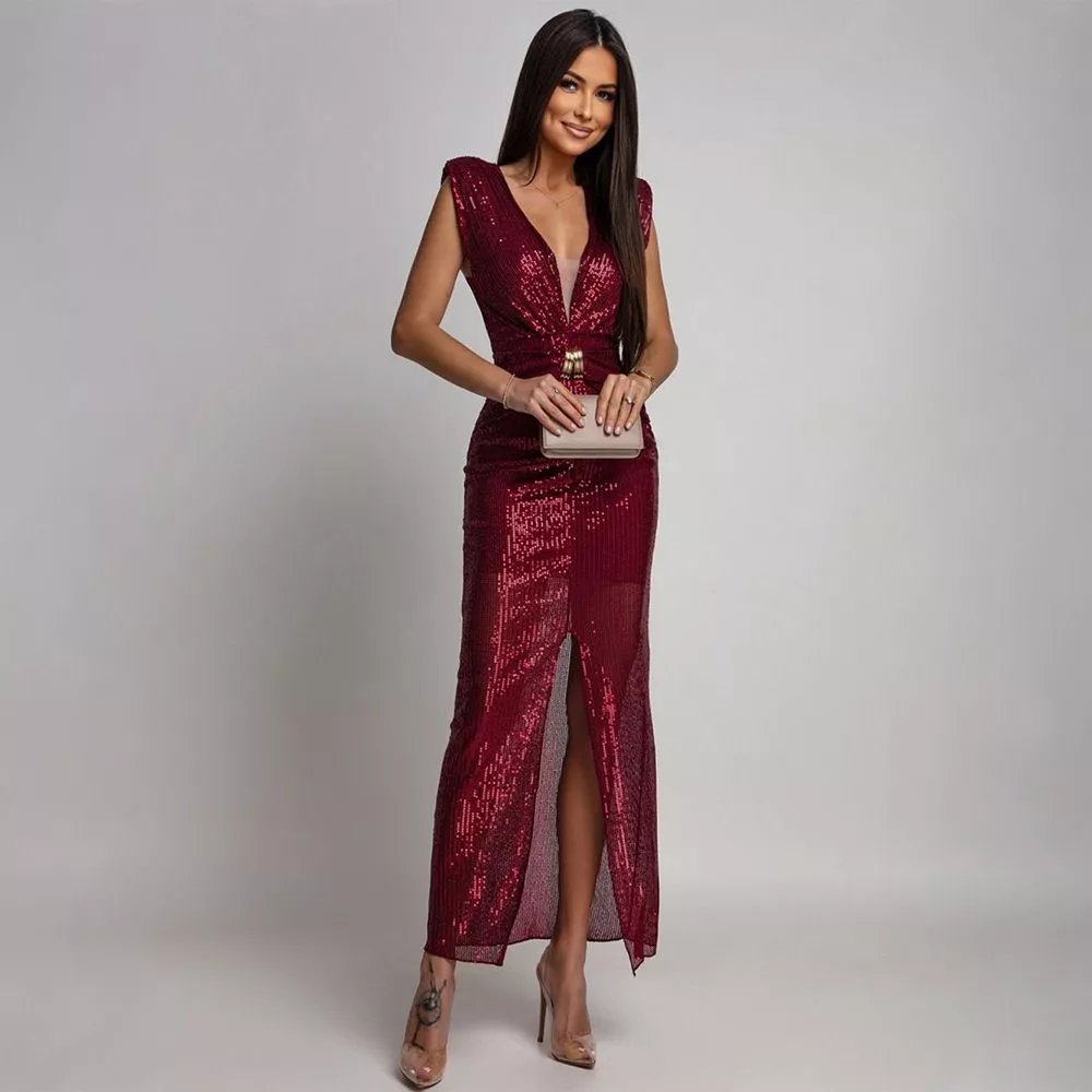 Vestito Lungo Elegante Paillettes Scollo V Spacco Rosso Vino CF67151