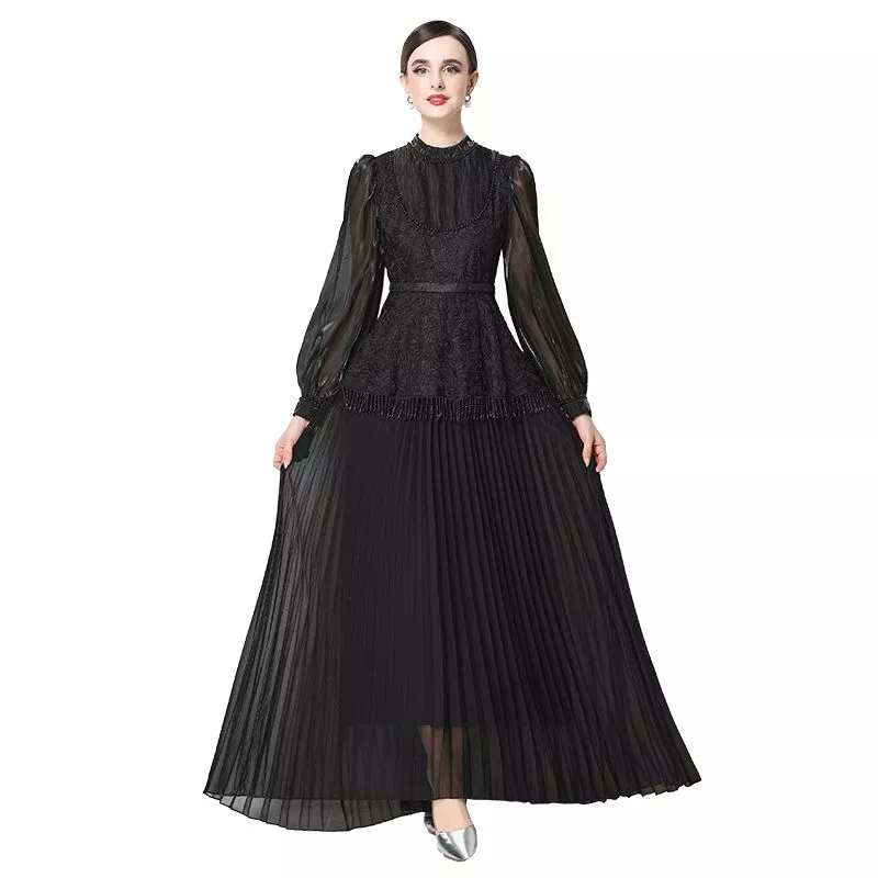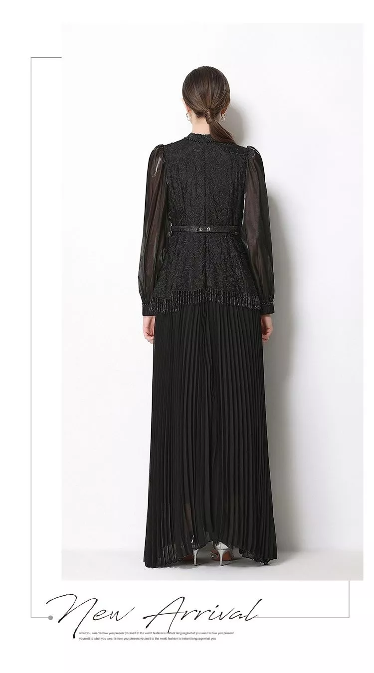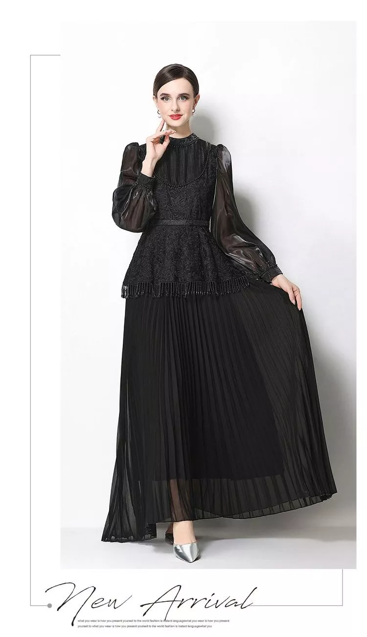 Vestito Lungo Elegante Pizzo E Gonna Plissé Maniche Trasparenti Nero CF68670