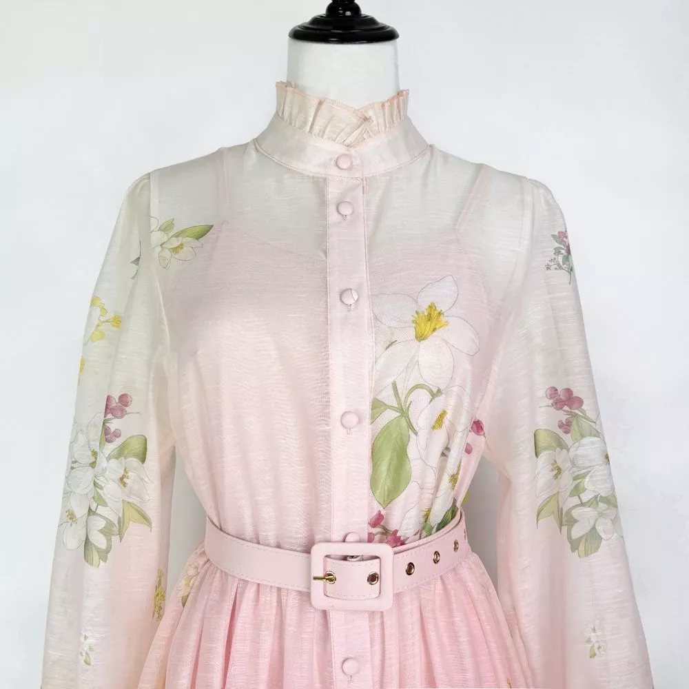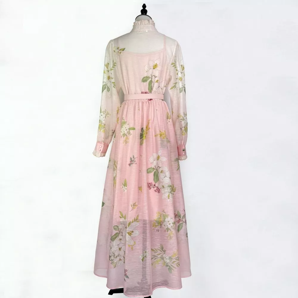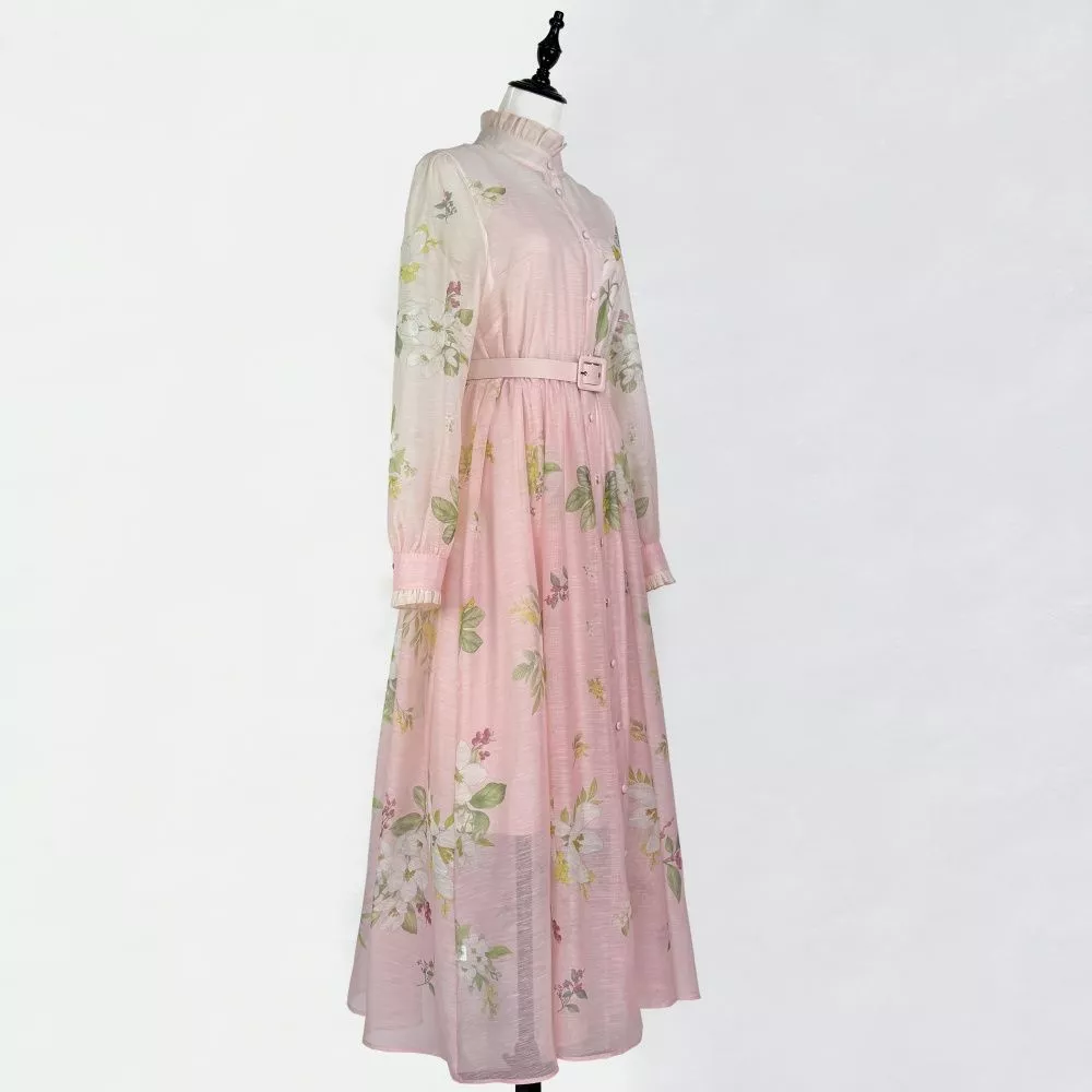 Vestito Lungo Elegante Rosa Floreale Con Cintura Maniche Lunghe CF66879