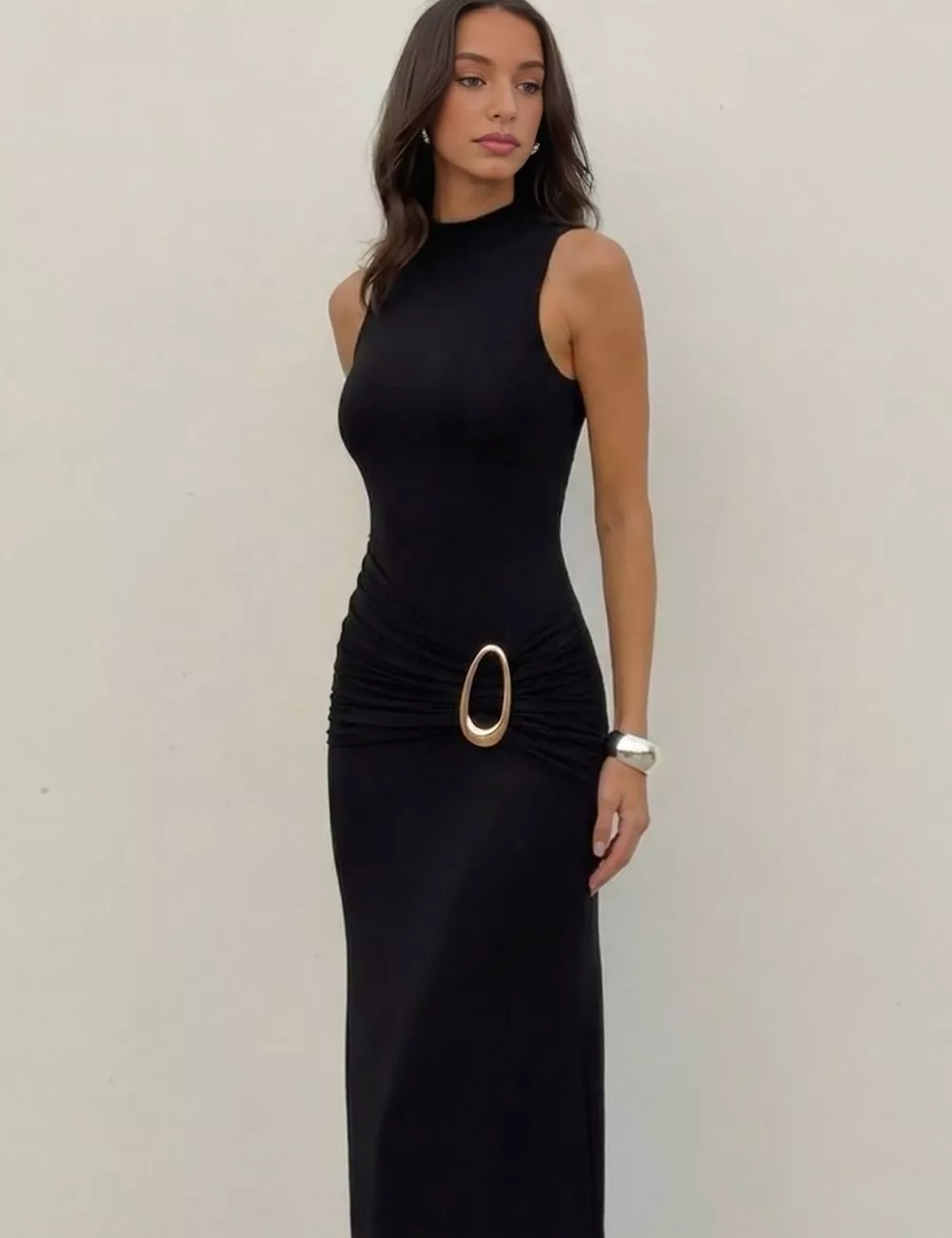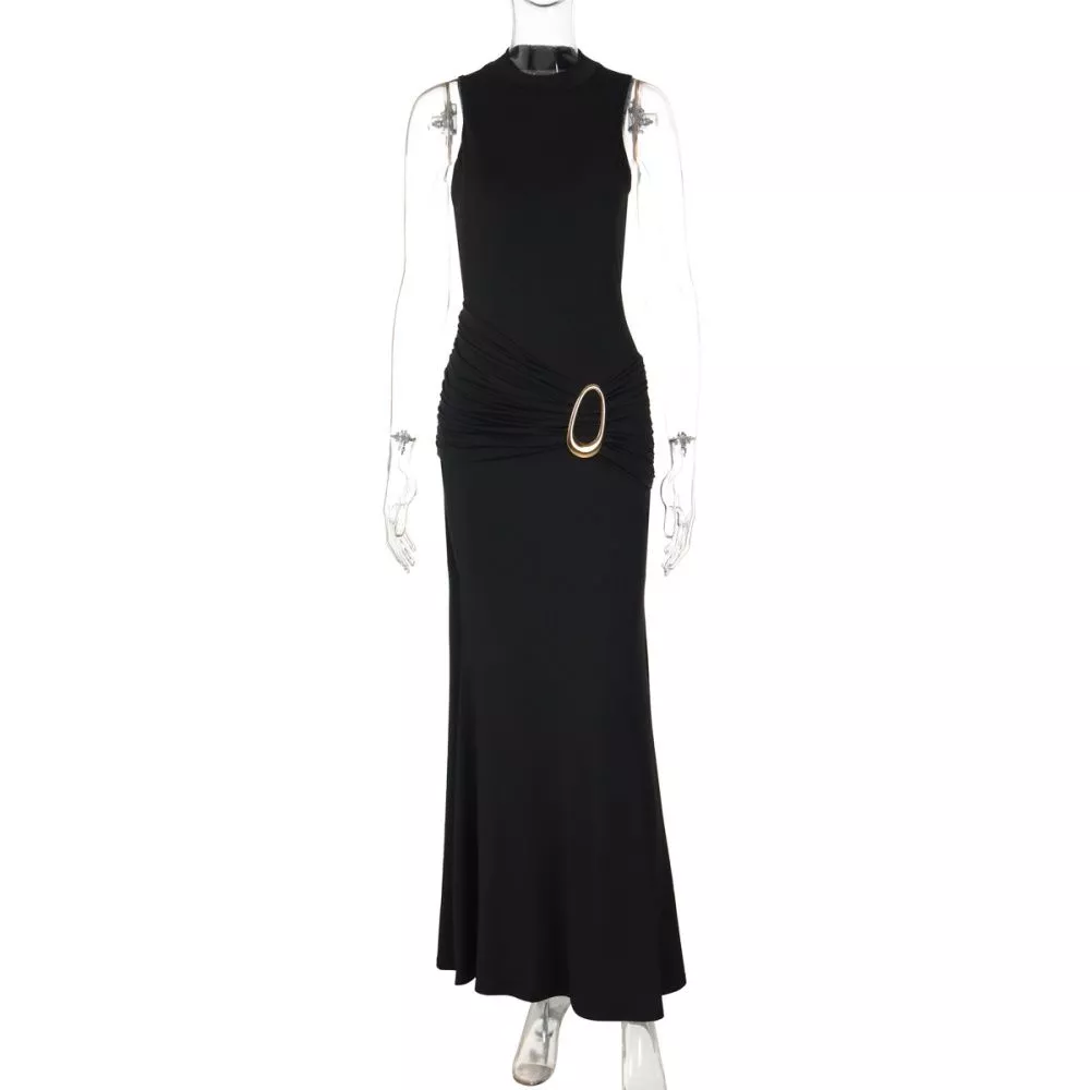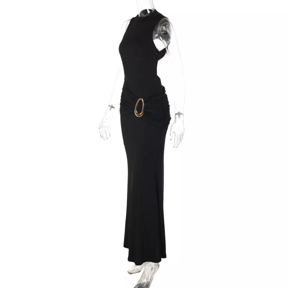 Vestito lungo elegante da sera dal design essenziale e sensuale, caratterizzato da linea aderente e struttura halter che valorizza spalle e décolleté. Il punto vita è evidenziato da un dettaglio metallico color oro che crea un effetto visivo raffinato e slancia la silhouette. Il fondo leggermente svasato accompagna il movimento rendendo il capo ideale per eventi serali, cerimonie e occasioni formali in cui è richiesto uno stile deciso e sofisticato.