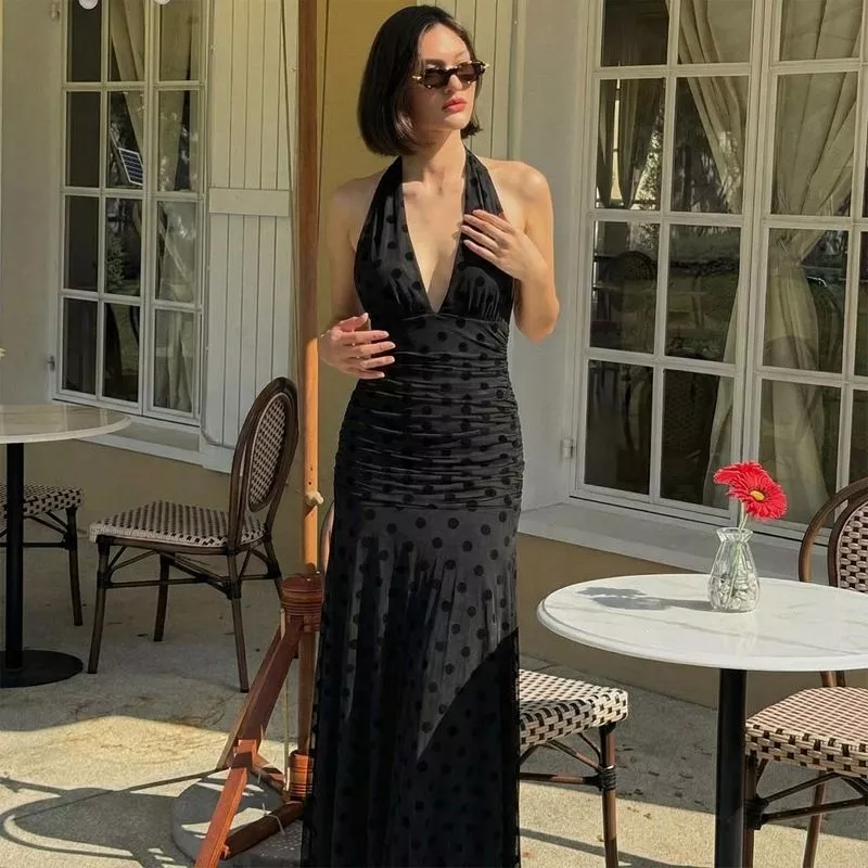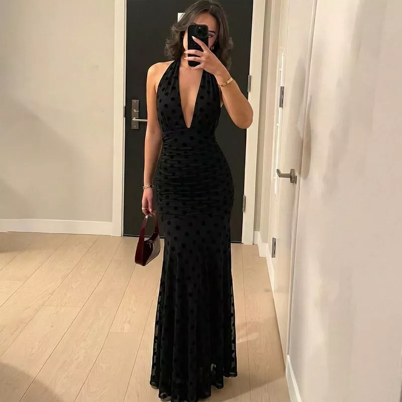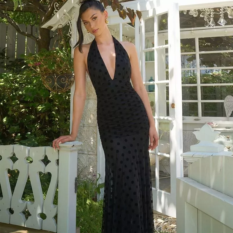 Vestito lungo elegante da sera dal design sensuale e raffinato, caratterizzato da profondo scollo a V e linea aderente che valorizza la silhouette. Il motivo a pois tono su tono dona profondità e movimento al tessuto, mentre il taglio halter lascia le spalle scoperte creando un effetto femminile e deciso. Perfetto per eventi serali, cerimonie e occasioni speciali in cui è richiesto uno stile sofisticato ma d’impatto.