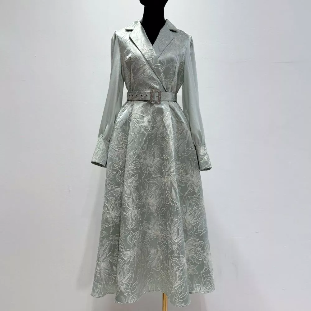 Vestito Lungo Elegante Verde Cintura Decorativa E Maniche Trasparenti CF66019