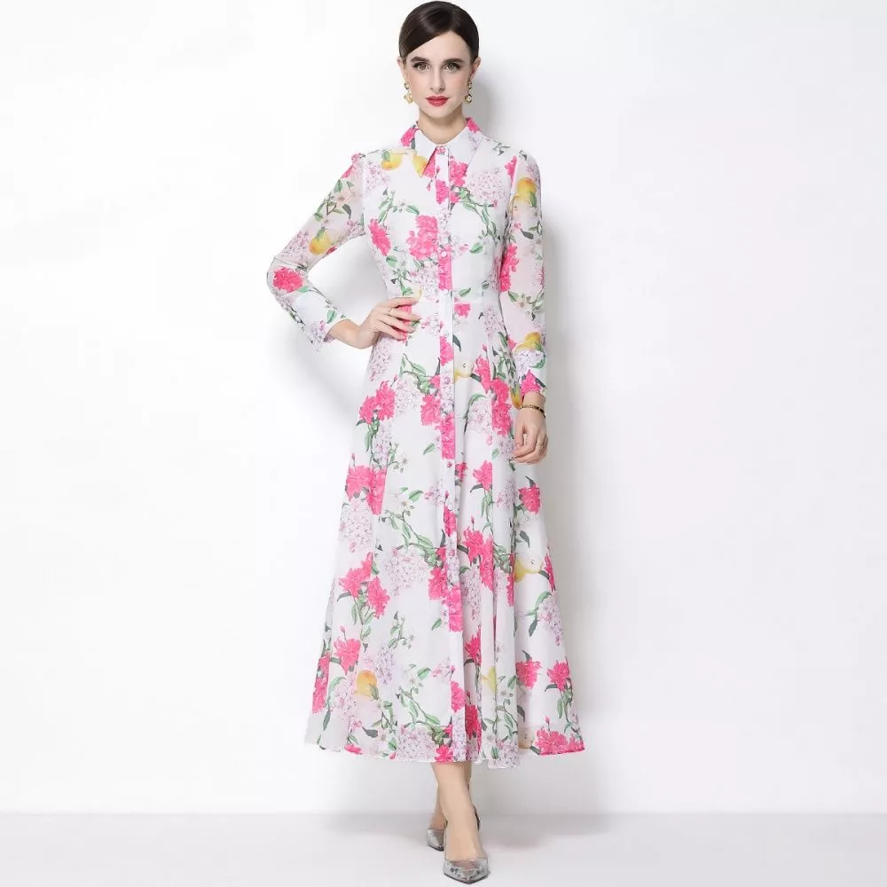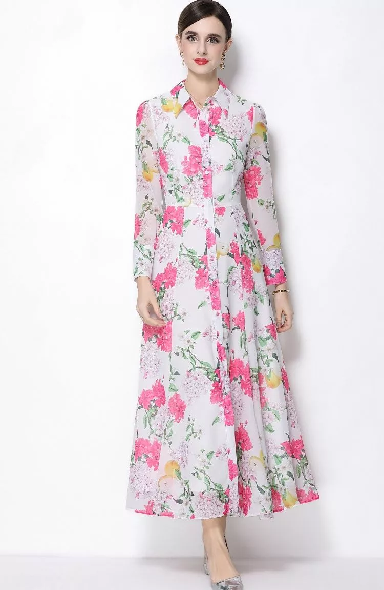 Vestito Lungo Floreale Con Vita Definita Maniche Lunghe Rosa CF66021