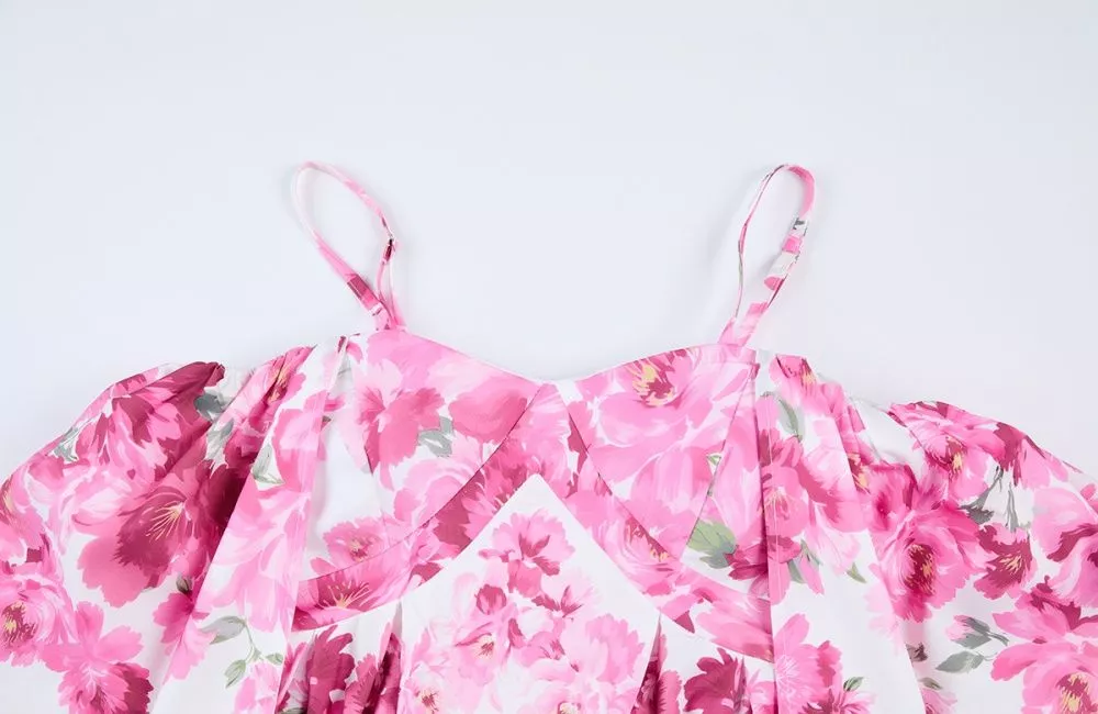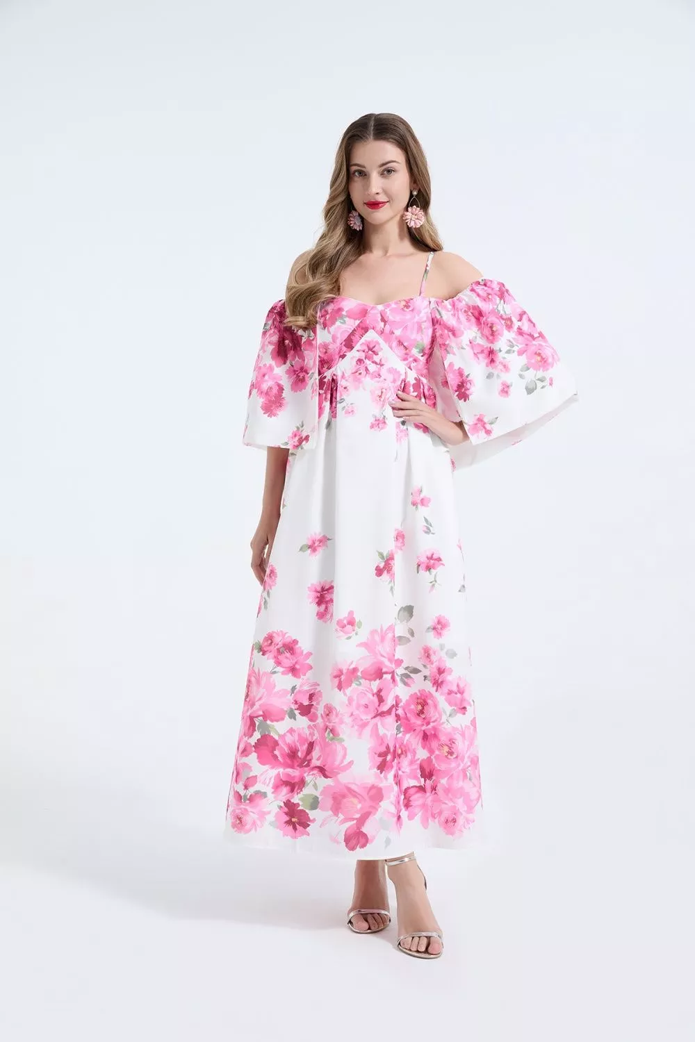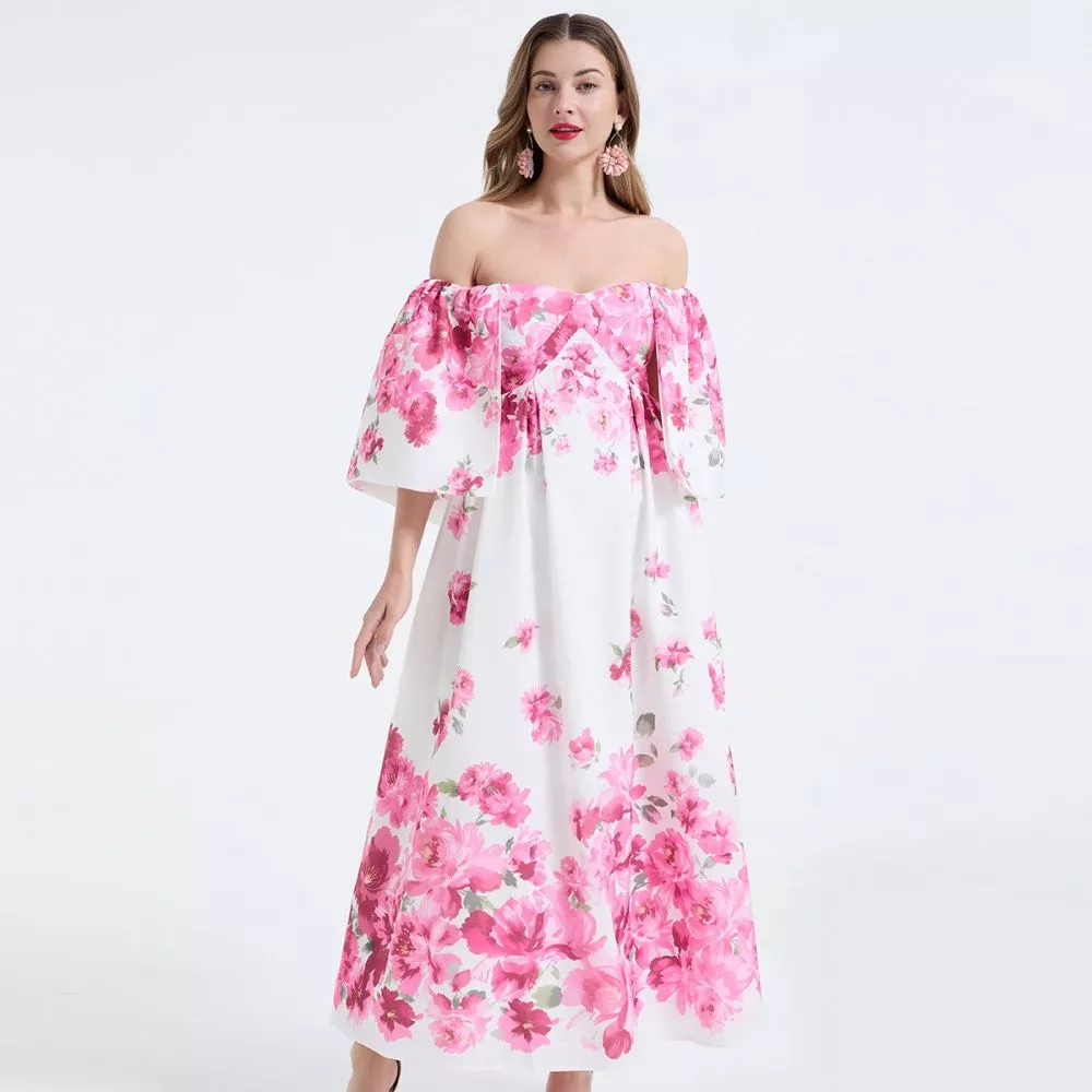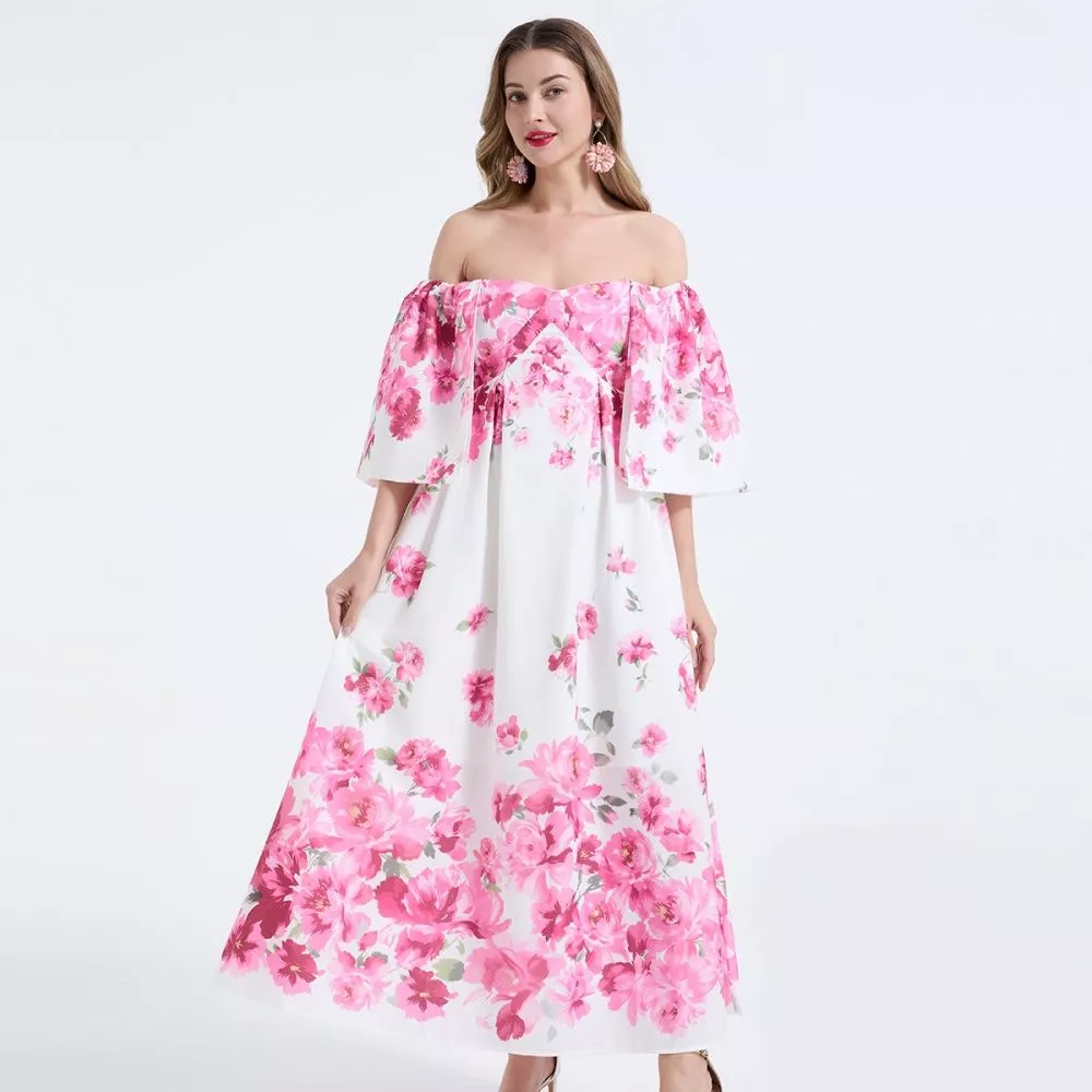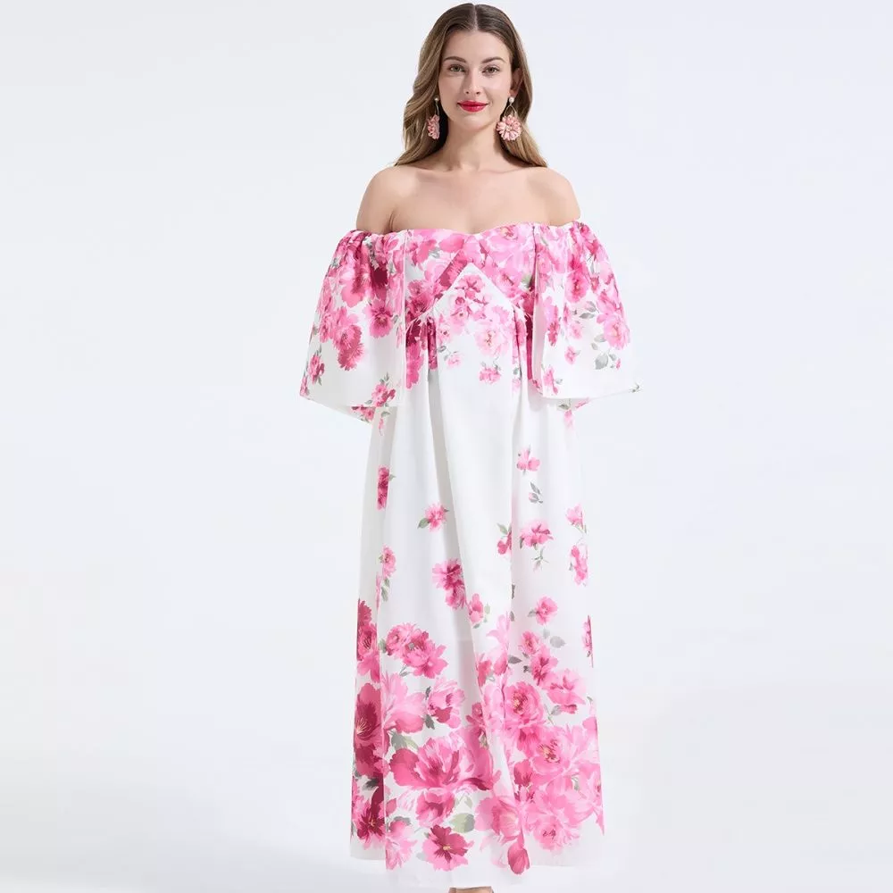 Vestito Lungo Floreale Rosa Spalle Scoperte Maniche Ampie CF68245