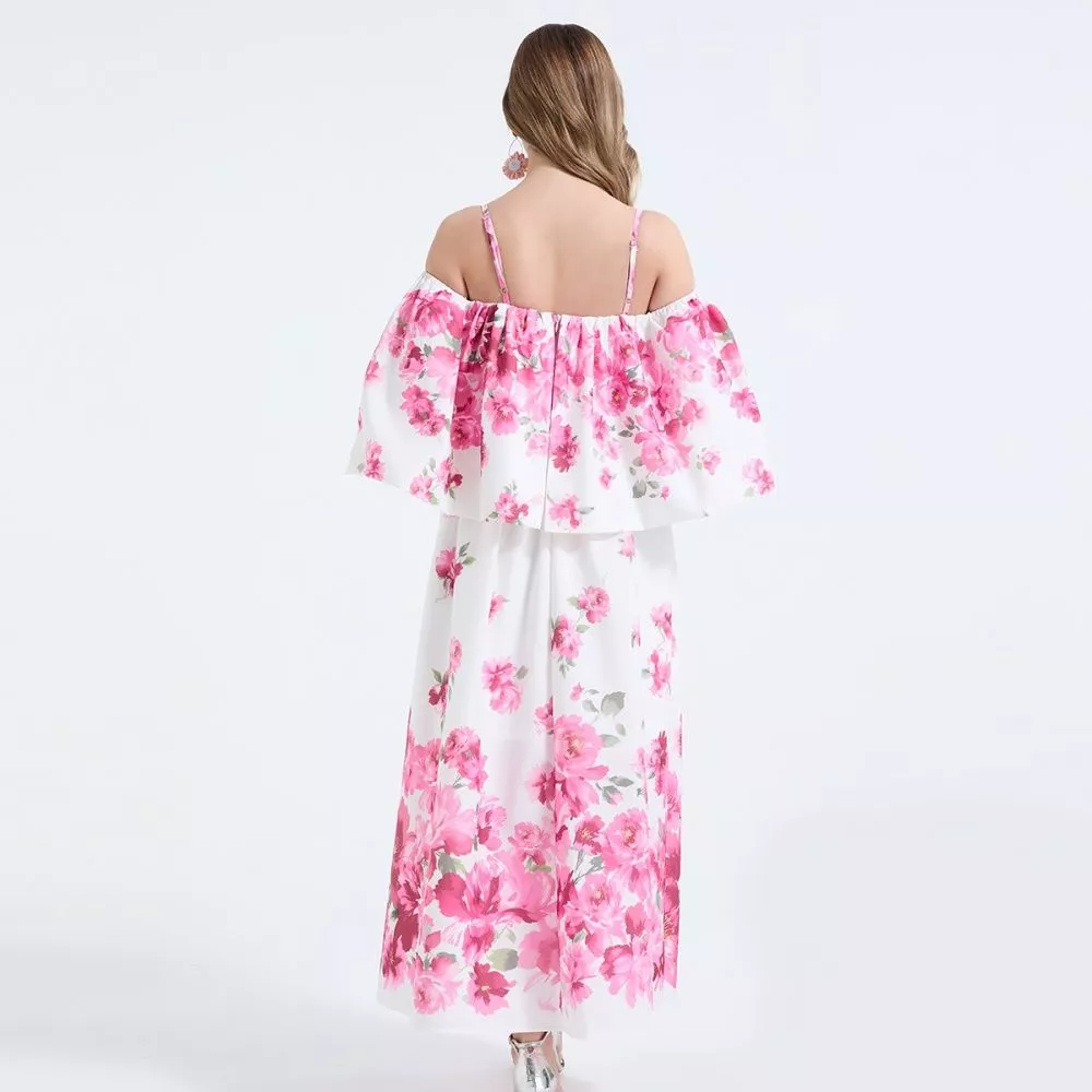 Vestito lungo floreale dal design romantico e femminile, caratterizzato da scollo a spalle scoperte con fascia elasticizzata che valorizza il décolleté con eleganza naturale.