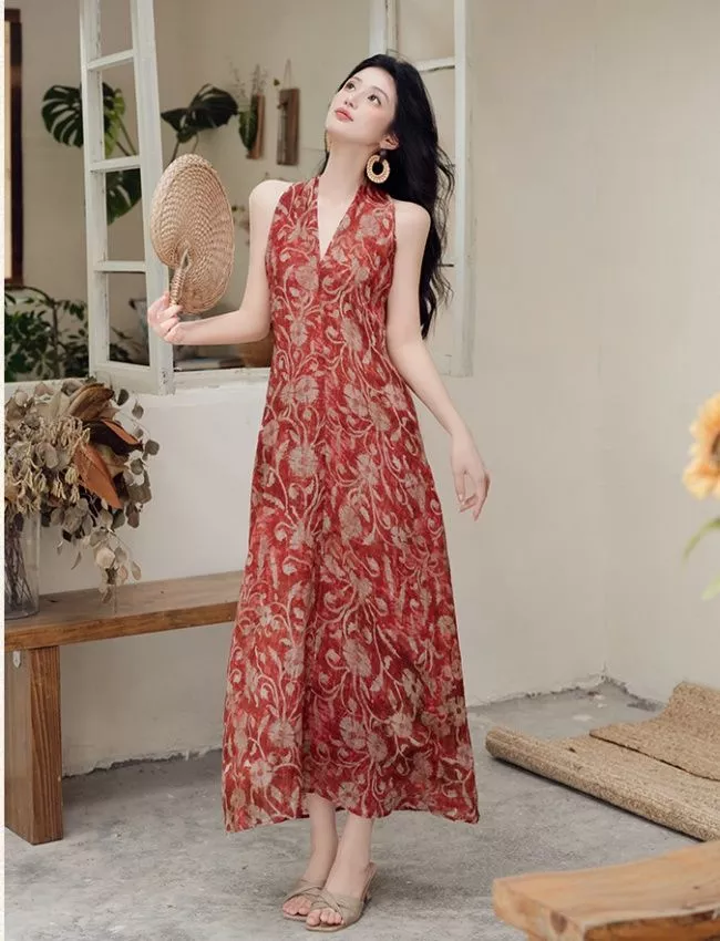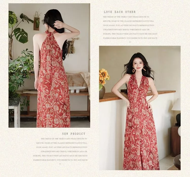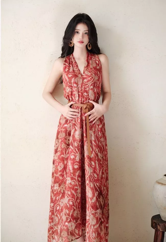 Vestito lungo halter con fantasia floreale nei toni del rosso e beige, caratterizzato da linea fluida e silhouette slanciata. Il design senza maniche valorizza spalle e collo, mentre la cintura in vita definisce la figura con equilibrio e armonia.