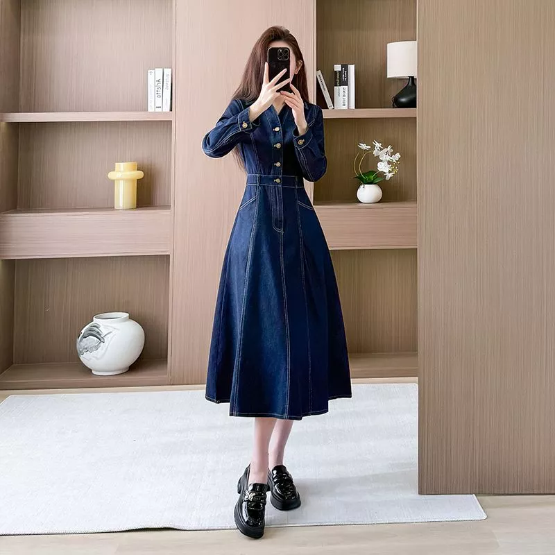 Vestito Lungo Jeans Denim Con Cintura Maniche Lunghe Vestito Camicia Blu CF68788