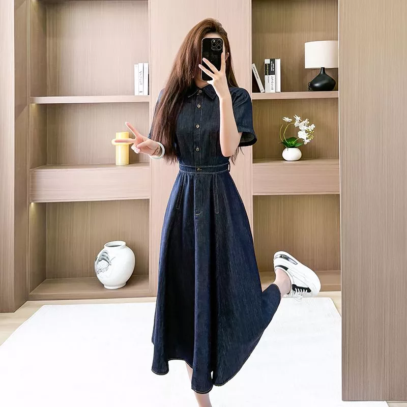Vestito Lungo Jeans Denim Maniche Corte Vestito Camicia Svasato Blu CF68789