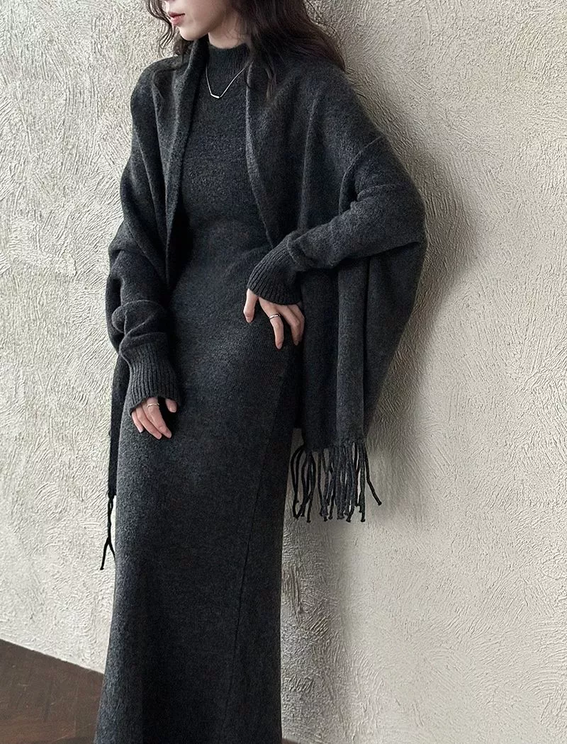 Un completo raffinato composto da vestito lungo in maglia morbida e mantella coordinata con frange, perfetto per creare look eleganti e avvolgenti. L'abito valorizza la figura grazie al taglio fluido e al collo morbido, mentre la mantella aggiunge movimento e dona un tocco sofisticato.