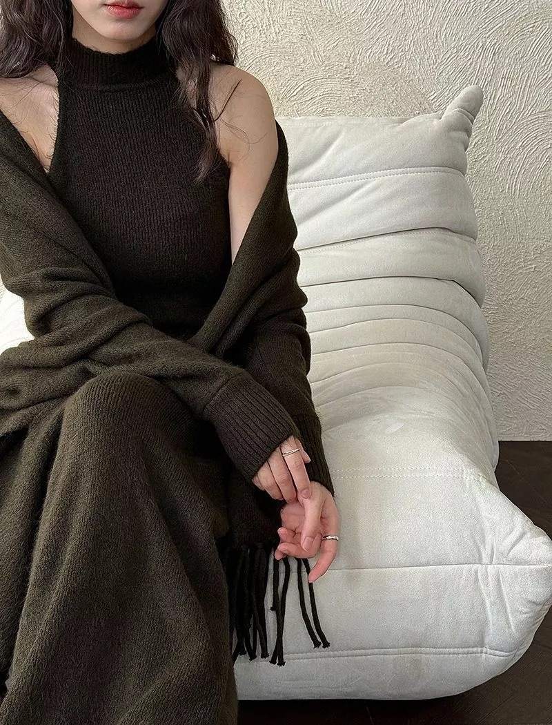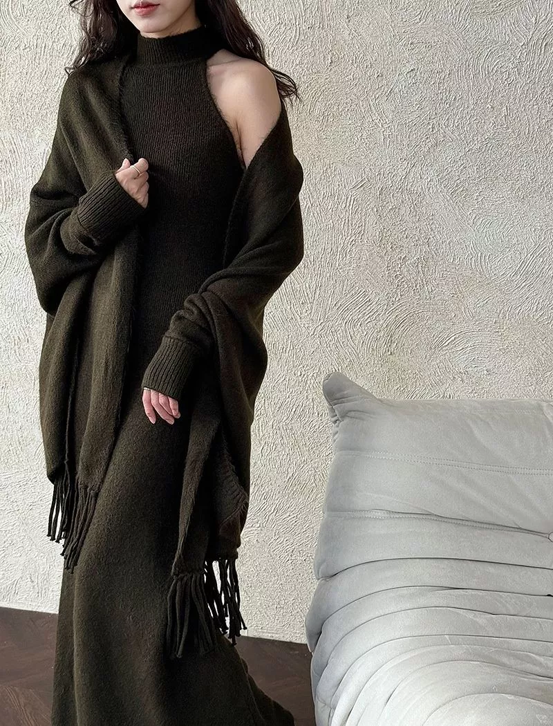 Un completo raffinato composto da vestito lungo in maglia morbida e mantella coordinata con frange, perfetto per creare look eleganti e avvolgenti. L’abito valorizza la figura grazie al taglio fluido e al collo morbido, mentre la mantella aggiunge movimento e dona un tocco sofisticato.