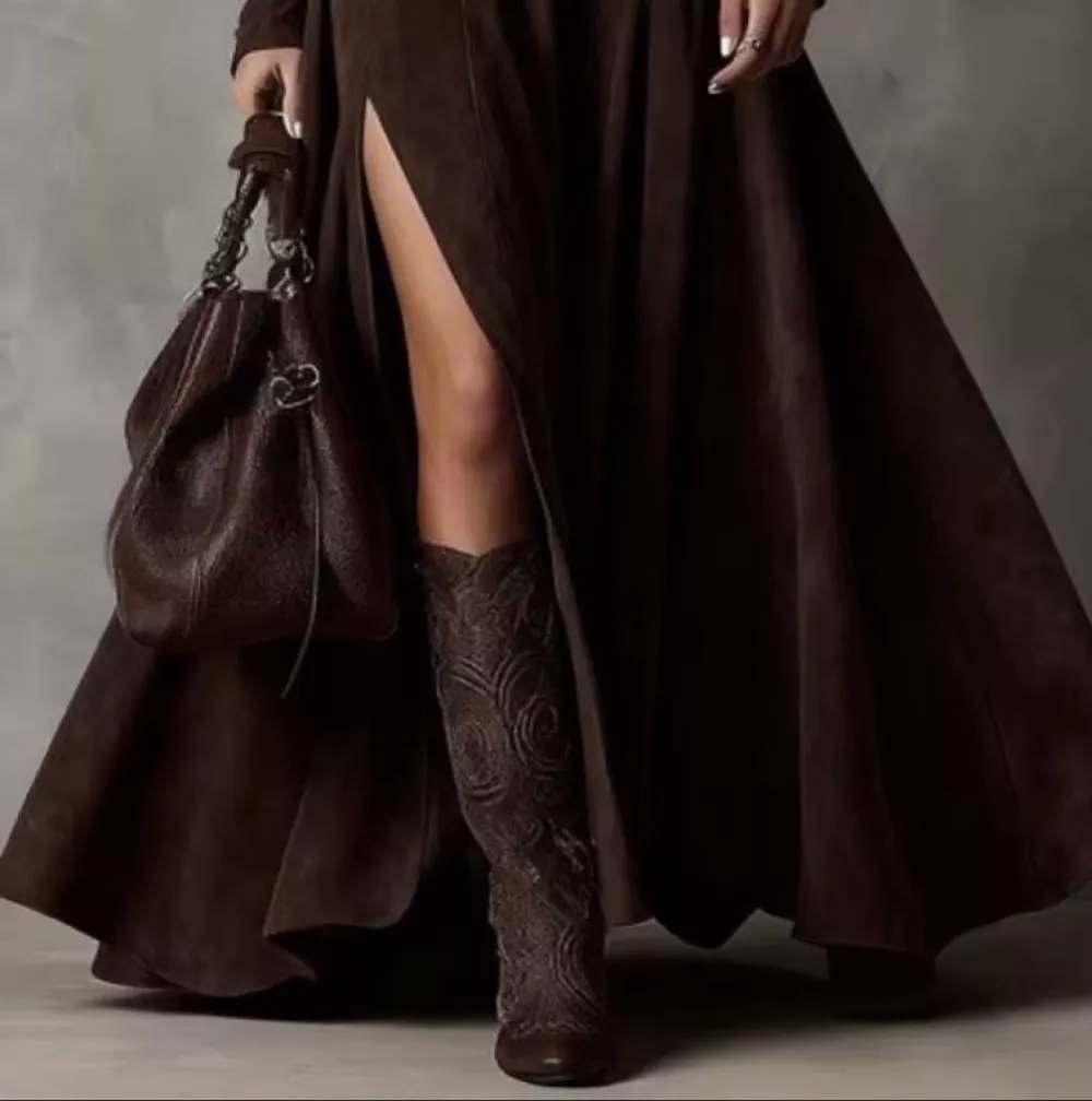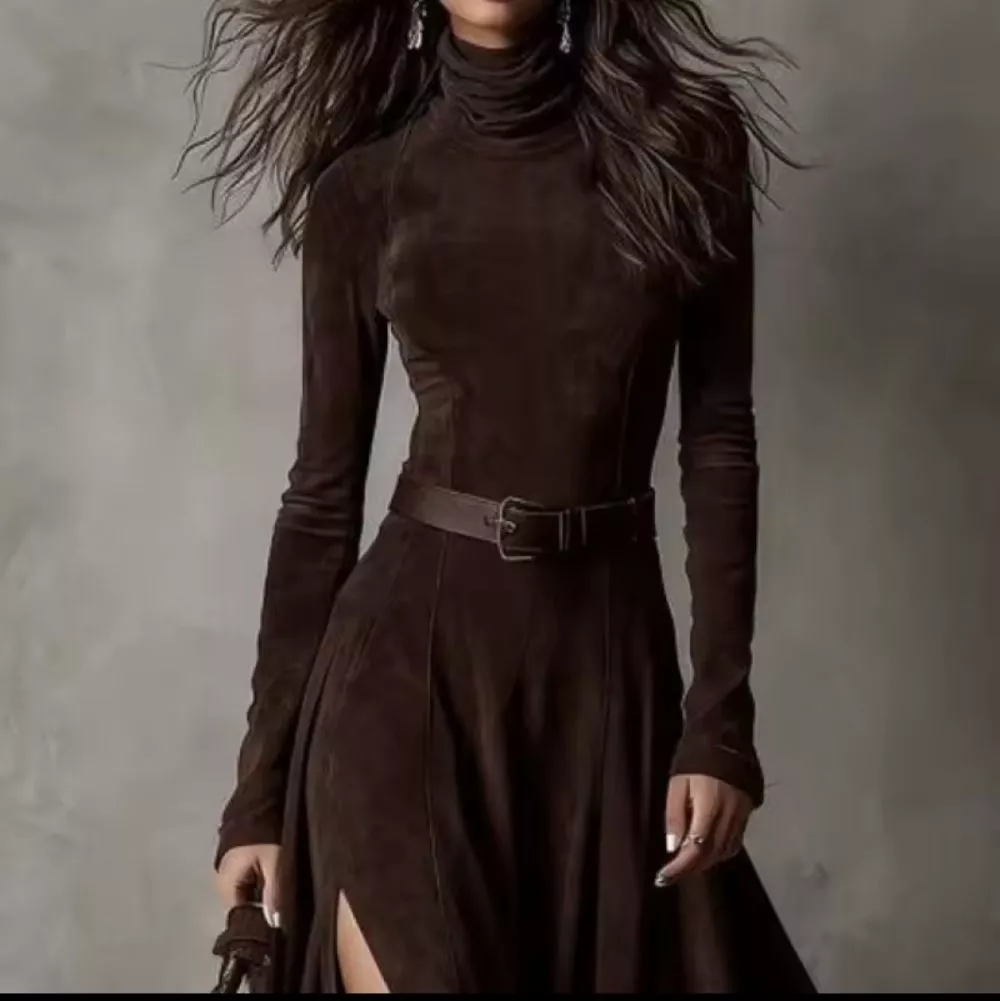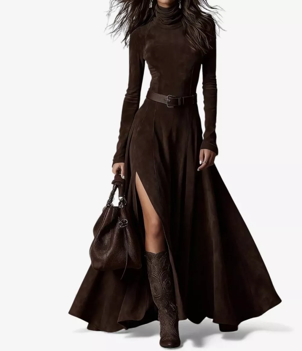 Vestito Lungo Marrone Virale Con Spacco Sensuale Look Elegante Donna Trend 5674