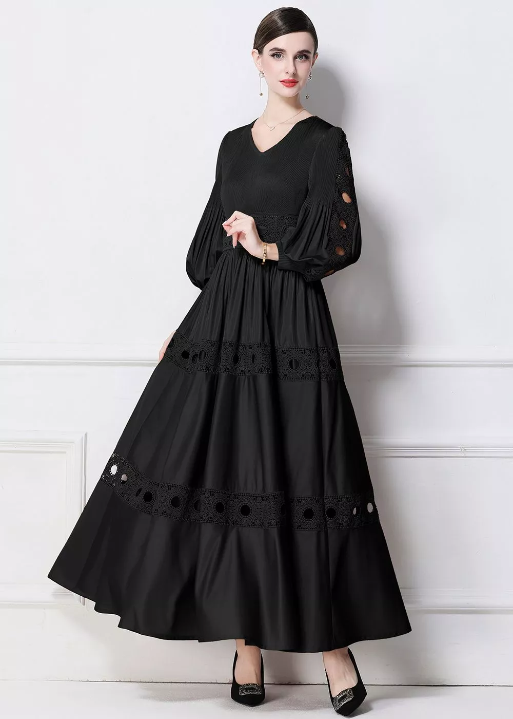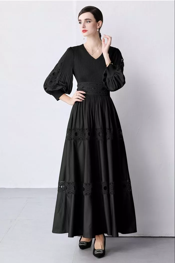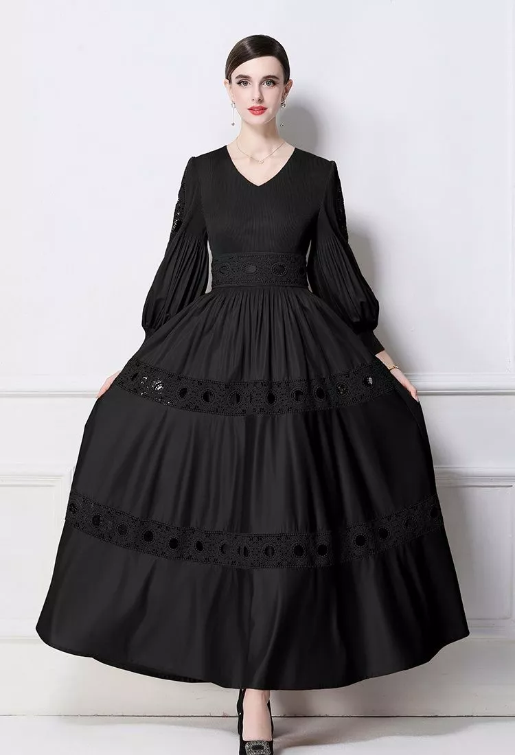 Vestito Lungo Nero Elegante Con Pizzo E Maniche Ampie A Palloncino CF56645