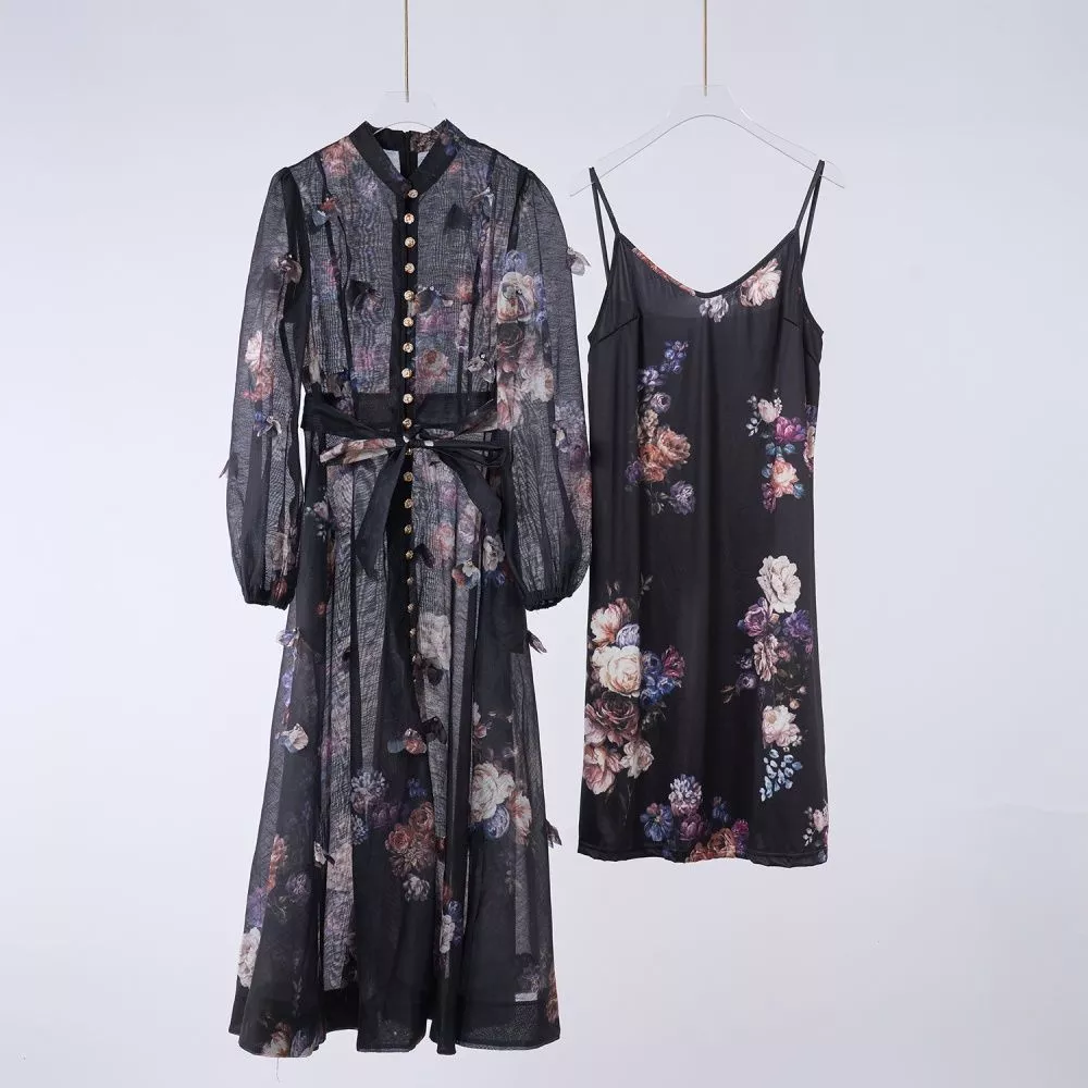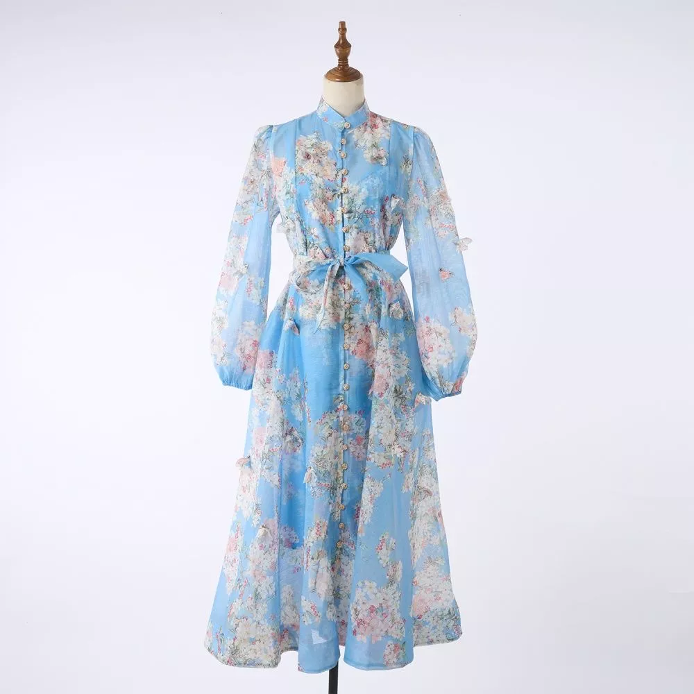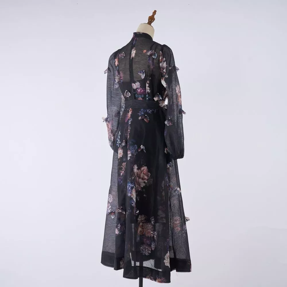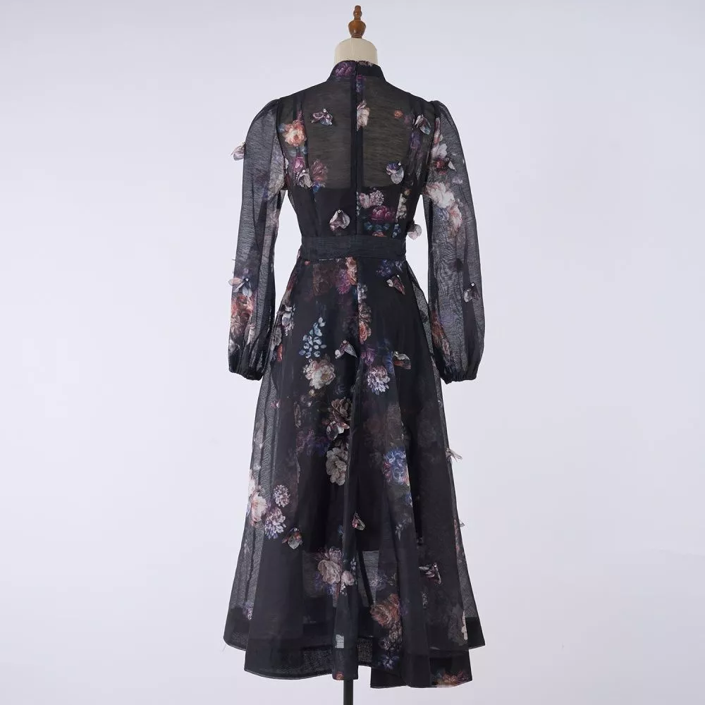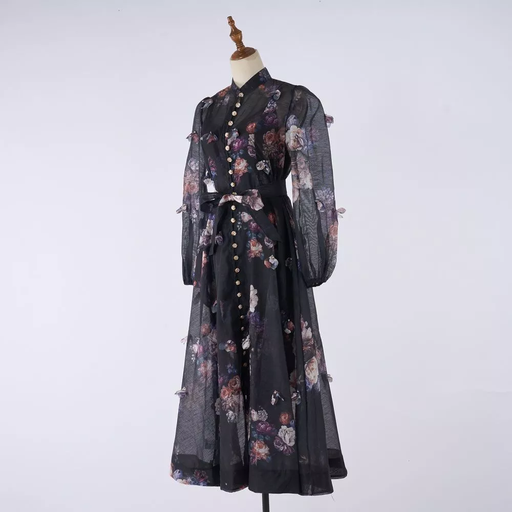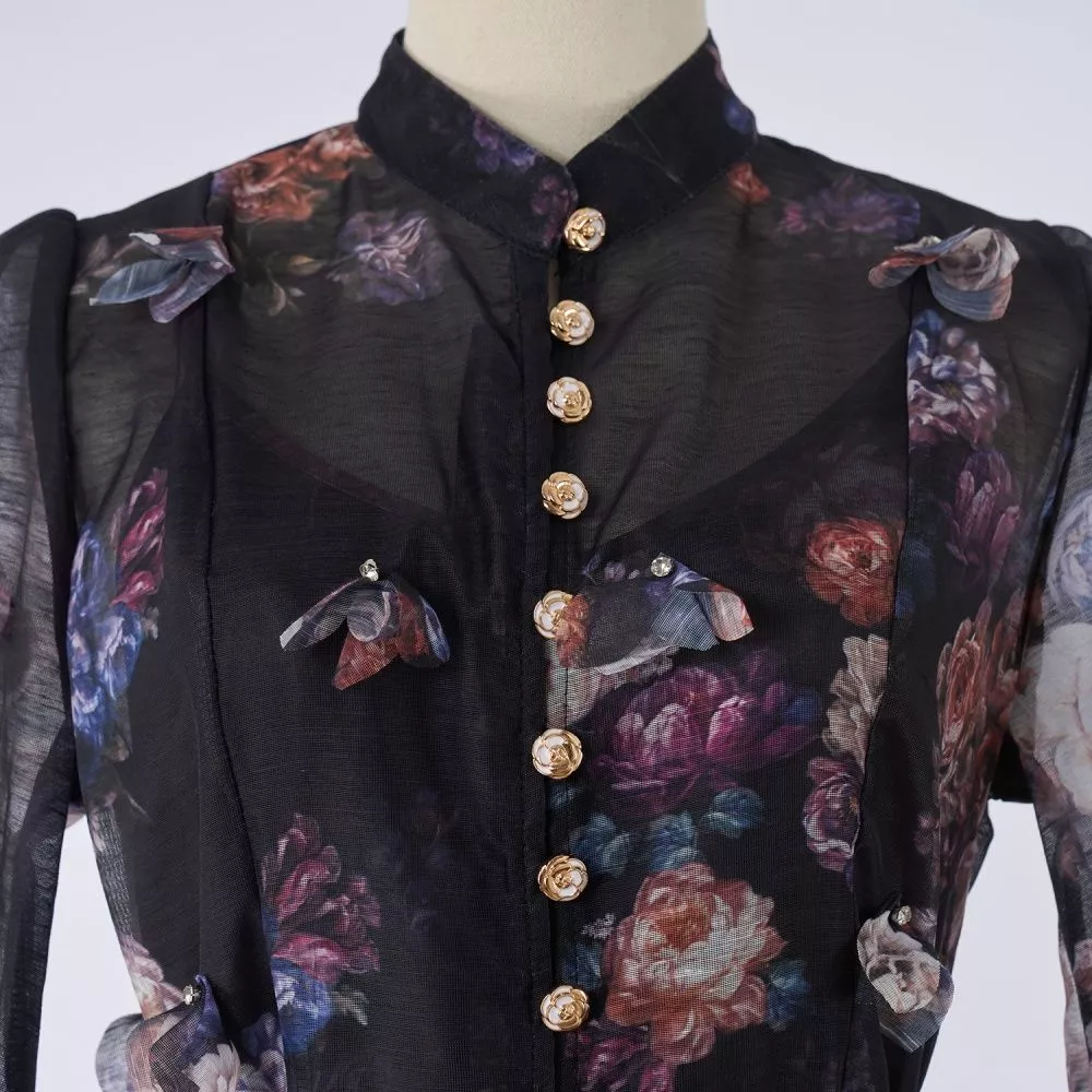 Un abito che unisce leggerezza e charme: questo vestito lungo in tulle floreale presenta un raffinato design con abbottonatura frontale, maniche lunghe trasparenti e cintura regolabile in vita per valorizzare la silhouette.