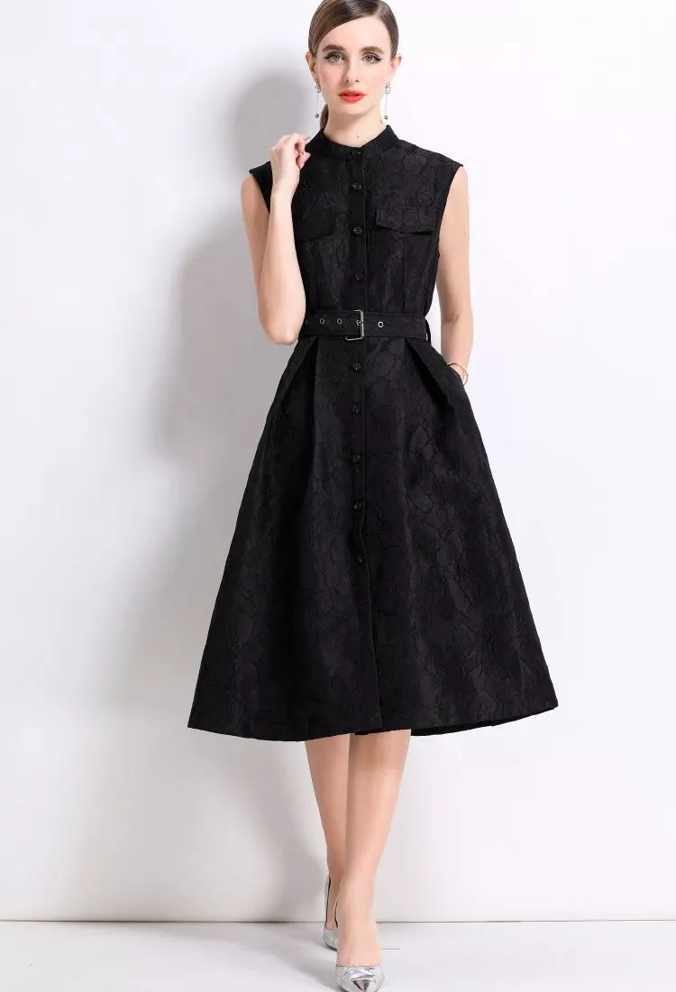 Un vestito lungo dal fascino senza tempo, perfetto per chi desidera un look elegante e raffinato. Realizzato in tessuto jacquard con motivo in rilievo, presenta un design senza maniche con bottoni a contrasto e una cintura coordinata che scolpisce il punto vita. La linea svasata della gonna esalta la femminilità, mentre il colore nero dona carattere e versatilità. Ideale sia per eventi formali che per outfit da sera chic e sofisticati.