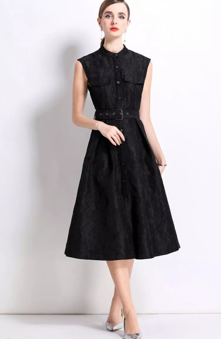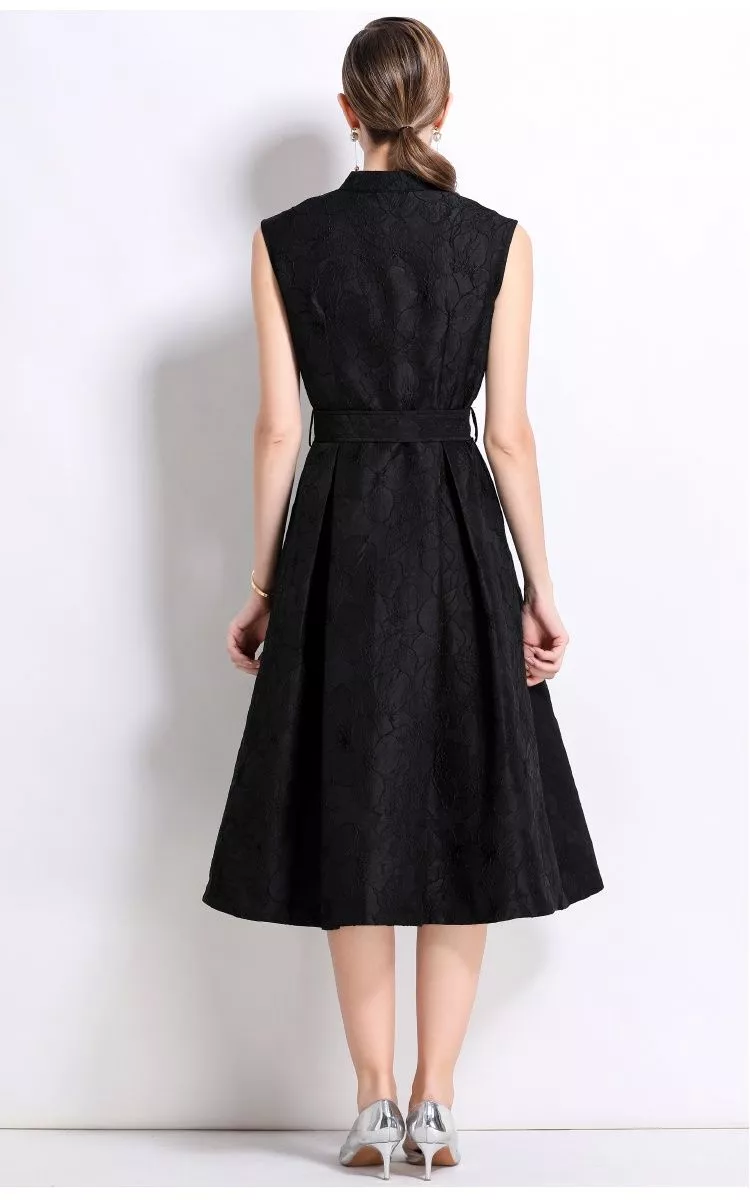 Vestito Lungo Nero Jacquard Senza Maniche Con Bottoni E Cintura Elegante CF54302