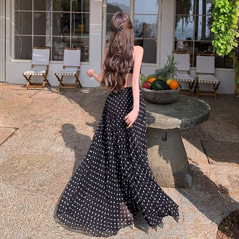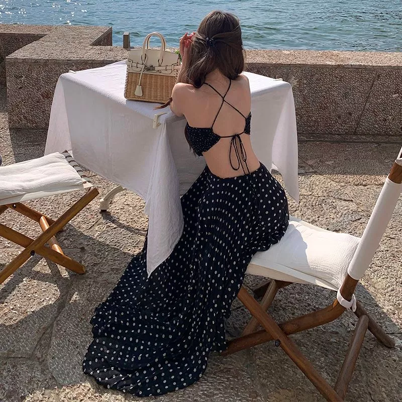 Vestito lungo nero a pois dal carattere femminile e raffinato, pensato per valorizzare la silhouette con una linea fluida e slanciata. Il design con scollo a cuore esalta il décolleté, mentre la schiena scoperta con lacci sottili crea un effetto sensuale e sofisticato. Il tessuto leggero accompagna il movimento con eleganza, rendendo il capo perfetto per look estivi di grande impatto e stile.